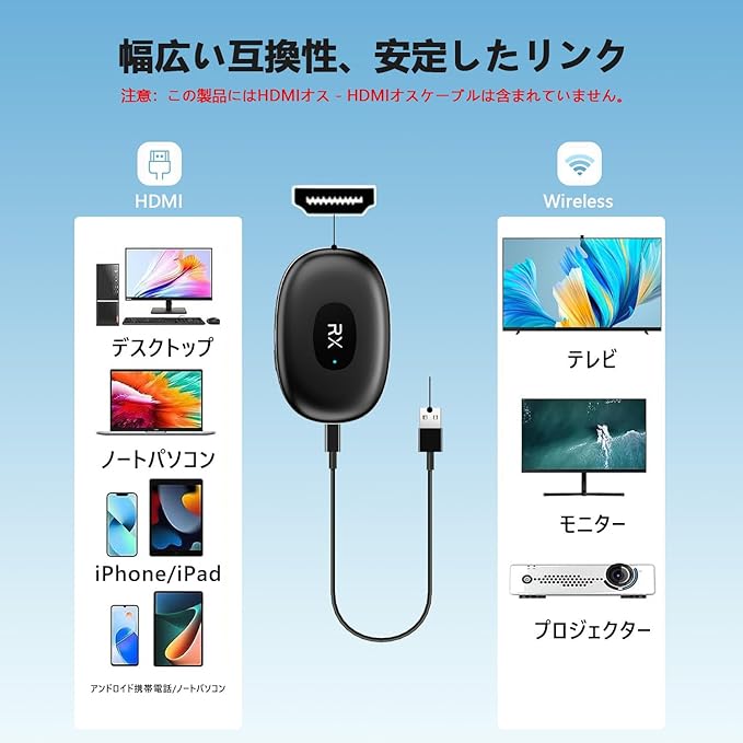 【1080P高解像度・4K高画質】最新発売のHDMI ミラーキャストは高画質、4K@30Hzまでの高精細ビデオを伝送でき。高解像度で色鮮やかな映像をお楽しみいただけます。精細な画像、ビデオ、鮮やかな色彩、滑らかな映像を楽しむことができます。HDMI ミラーキャストトランスミッターは5GHzの無線伝送規格技術を採用しており、遅延ただ0.1秒、HDMI信号を無線での長距離伝送でも安定です。もっと強化された信号ケーブルは、hdmi ミラーキャストがゼロ遅延でより安定した信号を受信し、より安定した信号を受け取り、バッファまたは遮断の可能性を低減することができる。