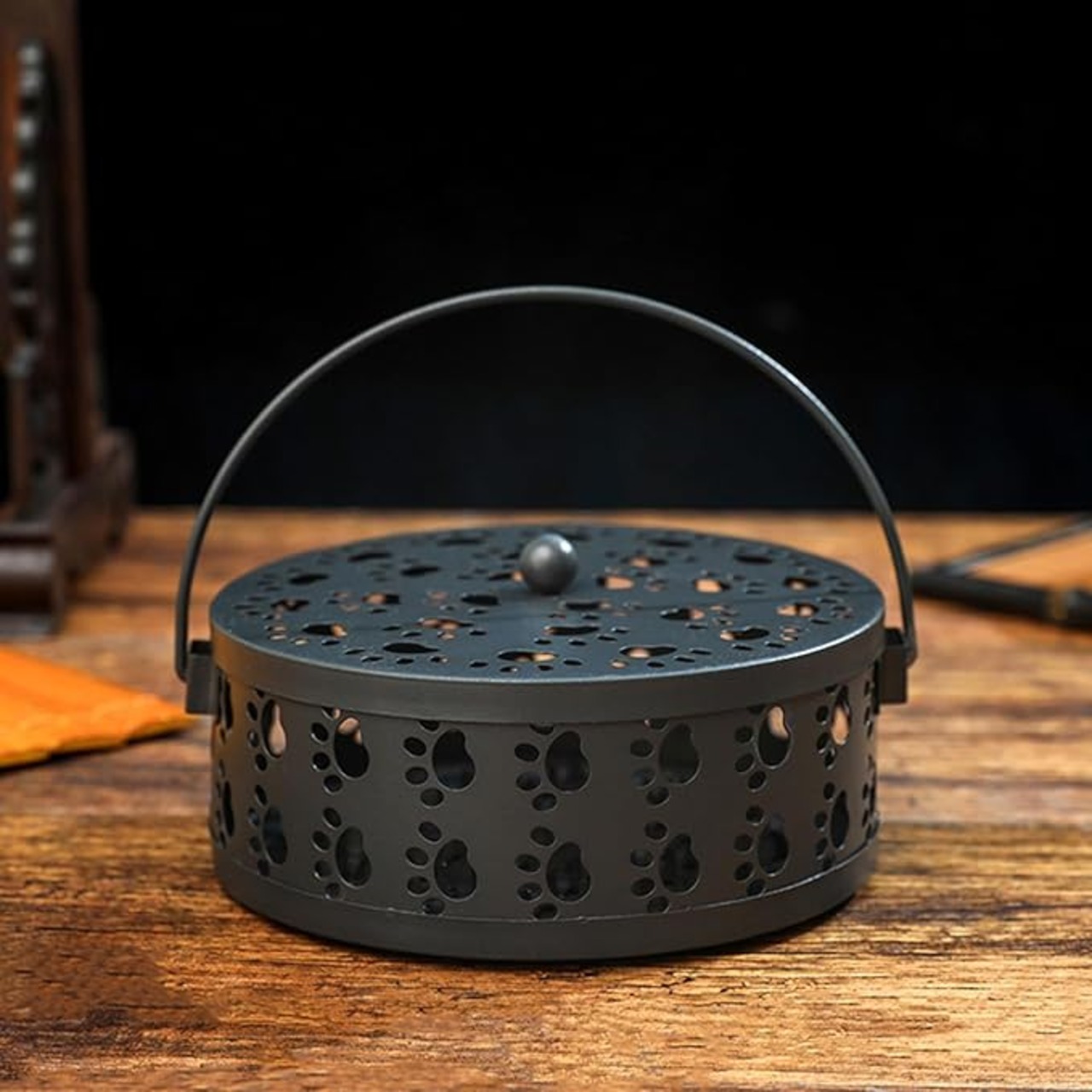 白檀香炉断熱蚊取り線香コンテナ鉄ホルダー蓋付きラウンド耐火猫爪中空デザイン金属昆虫 黒