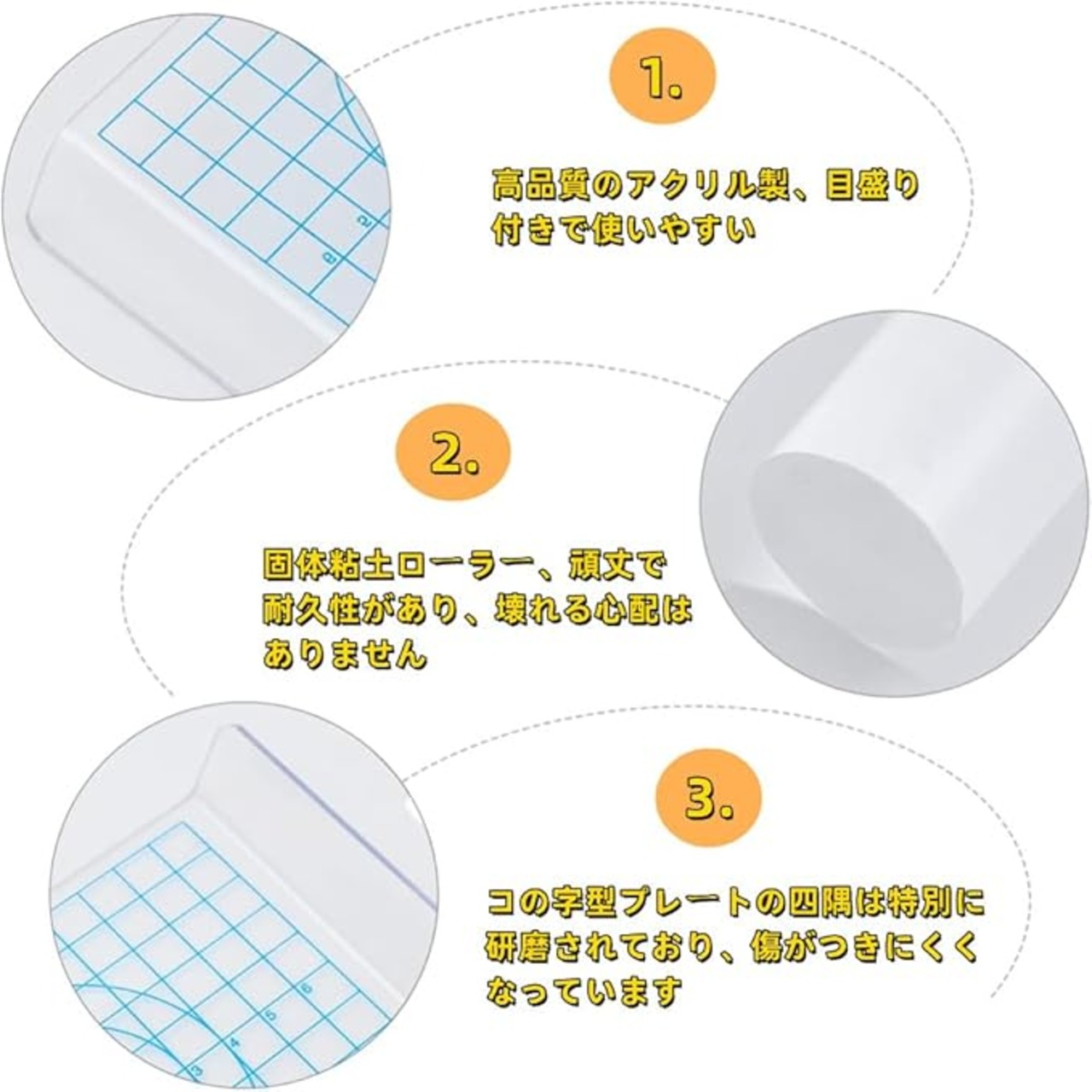 【商品仕様】2個セットです。サイズ:粘土ローラー:約19*5*2cm、粘土板:約17.5*10.8*0.4cm。(注:本体は透明、スケールの色はランダムです)