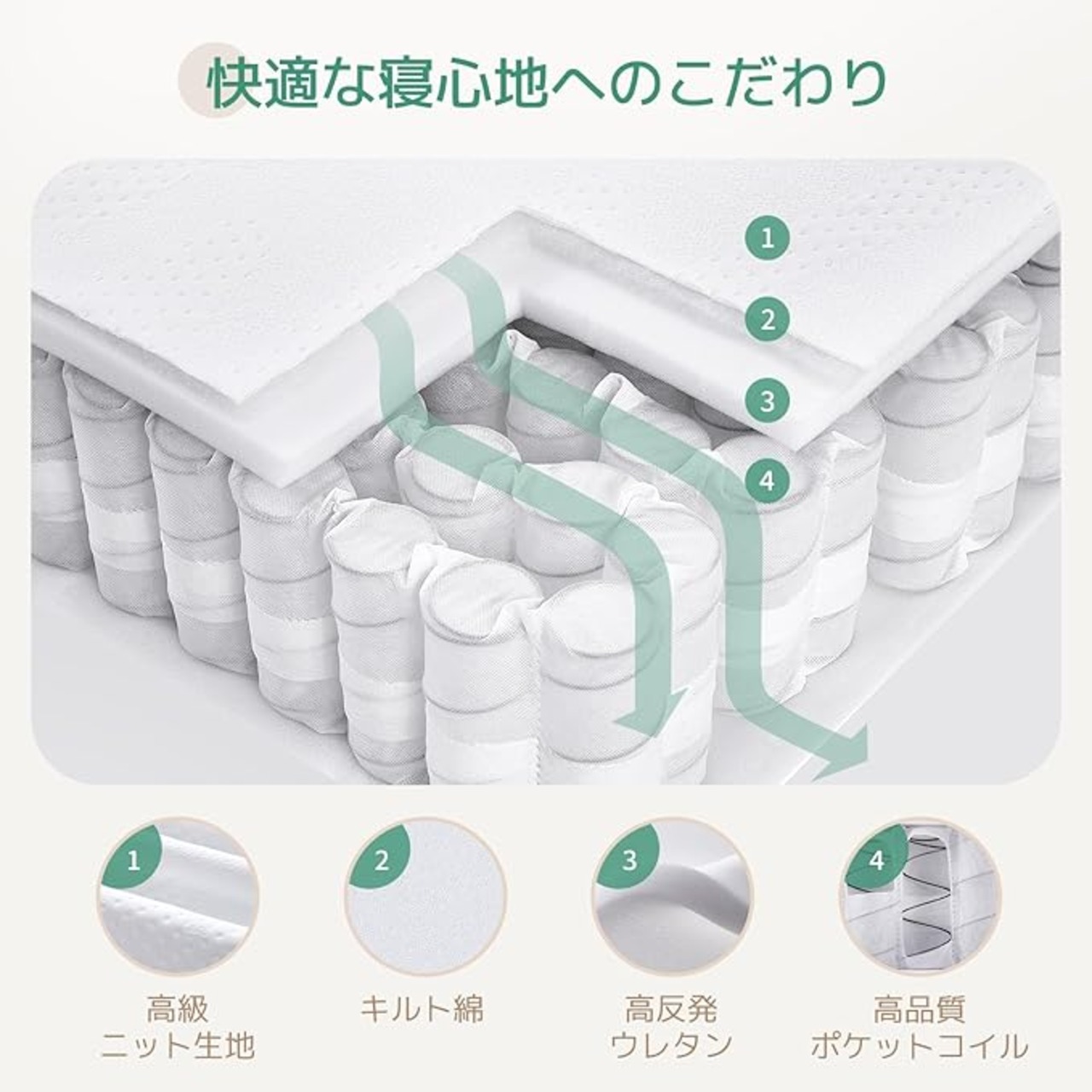 【四層クッション材】クイーン スプリングマットレスの上のクッション材は2cm高密度ウレタンとポリエステル中綿とキルト綿、不織布四種類の詰め物で組み合わさっているので、寝心地がよくて、へたりが早く、すぐに硬く感じられることも心配なく使用できます。