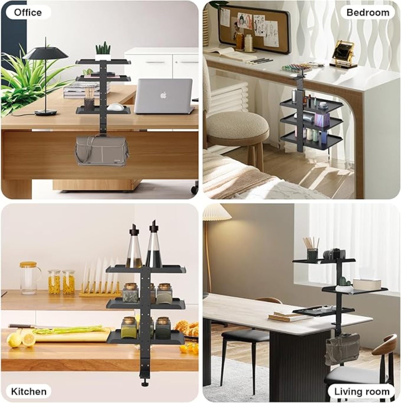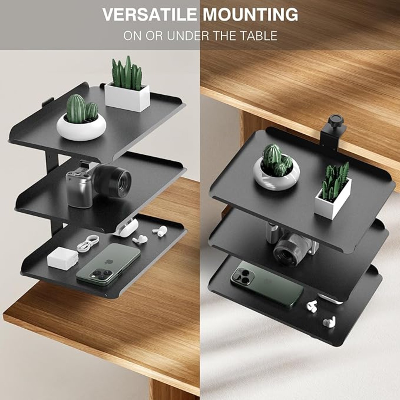 クランプ式机上ラック 3段 収納デスク上置棚 ヘッドホンスタンド付き 調節可能 卓上収納デスク 書架 机上本棚 机の上でも机の下でも 小物収納整理 文具用品収納 滑り止め 取り付けやすい 厚さ6.5cm以内のテーブルに設置可能 (マットブラック)
