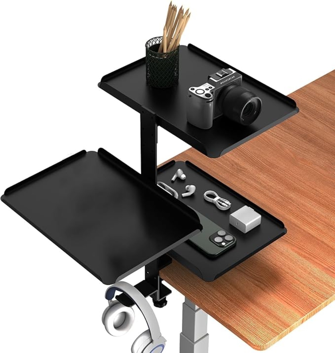 ヘッドホンスタンドと調節可能な収納トレイが付いた3段のデスク収納棚は、デスク上の整理整頓に適しています。