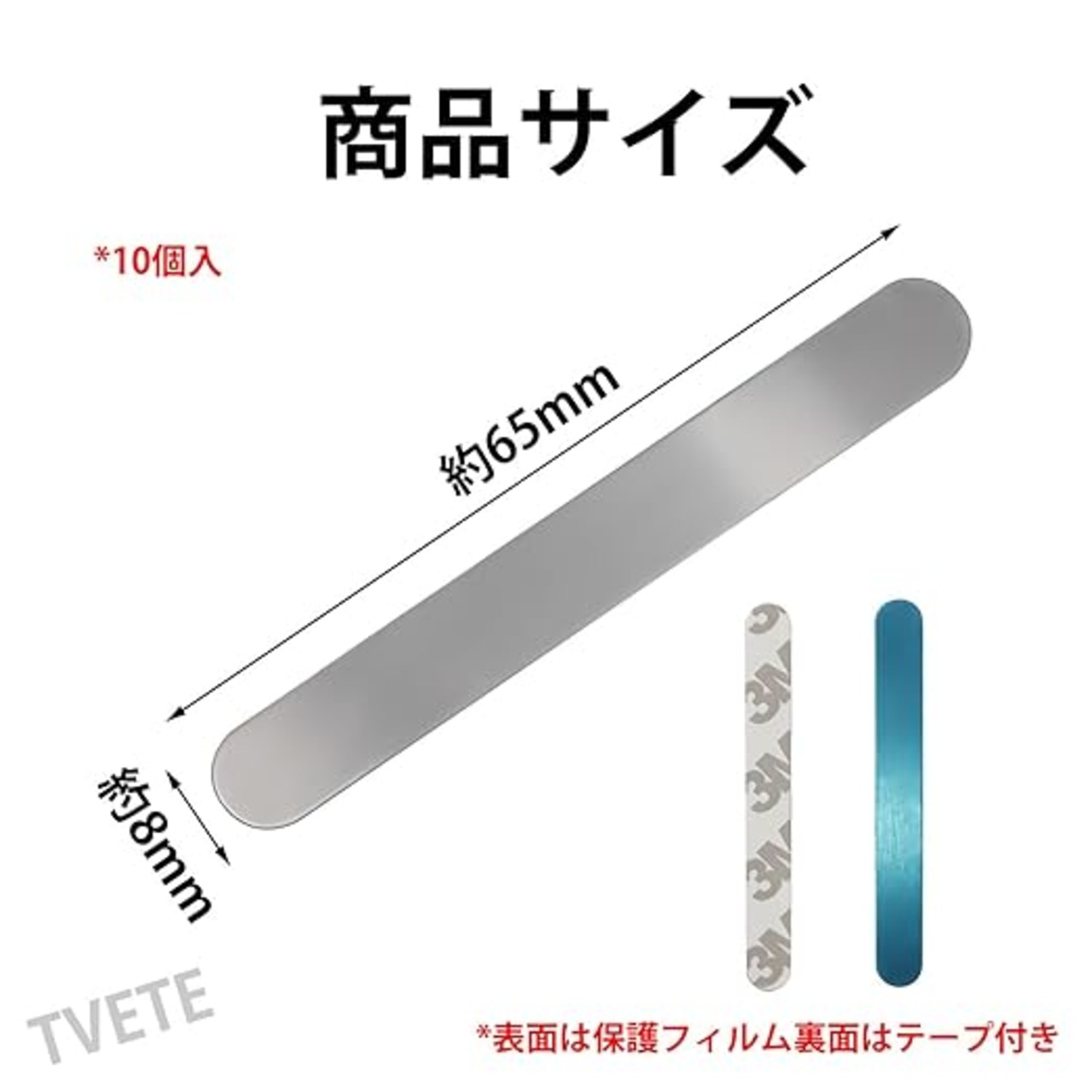 【商品内容】:スチールプレートのサイズは約65mm 8mmで、商品には鉄板が10枚入っています。粘着性の裏面は強力かつ柔らかく、簡単に取り付けたり取り外したりできるので、携帯電話を保護します。長めの帯状なので大画面の携帯電話にも適しており、鉄板を複数枚貼ってアピール力を高めることもできます。鉄板自体は磁性を帯びておりませんのでご注意下さい。