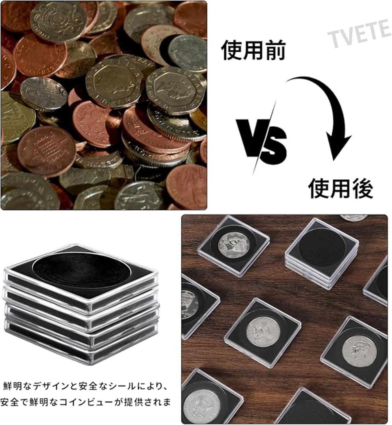 【商品内容】:記念硬貨コレクションボックスのサイズは約4.8 4.8 0.7cmです。このセットには24個の収納ボックスが含まれています。表面は部分的にフロスト加工が施されており、記念硬貨の存在感を際立たせています。異なる規格や種類の記念硬貨を個別に整理して保管できるため、硬貨同士の衝突や摩擦を防ぎ、破損のリスクを大幅に軽減します。