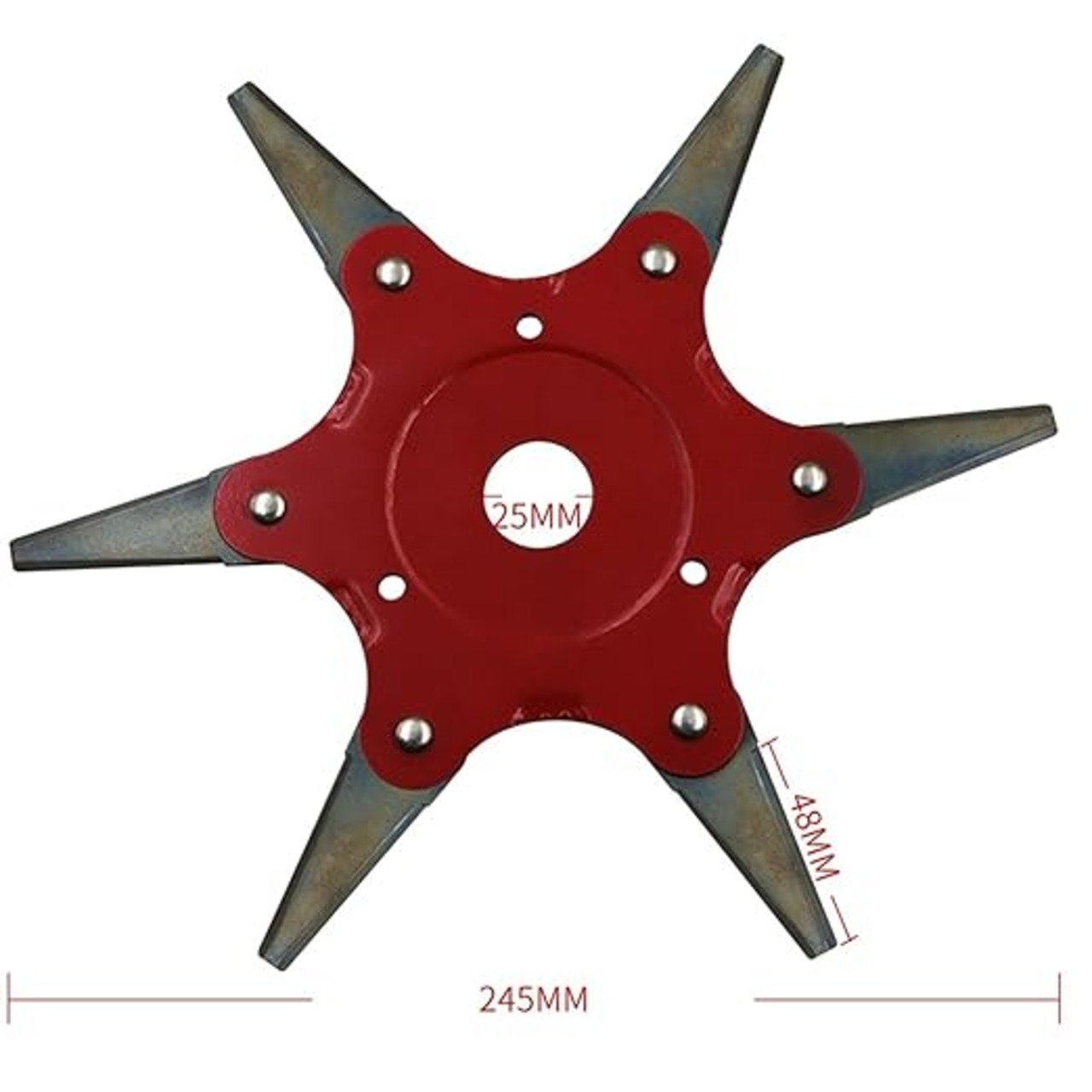マンガン鋼製の高品質な替え刃で、草刈り機用チップソーとして最適。6歯設計で効率的な草刈りを実現。取付穴径約25mm、直径約245mm、刃の長さ約48mmのサイズ感。