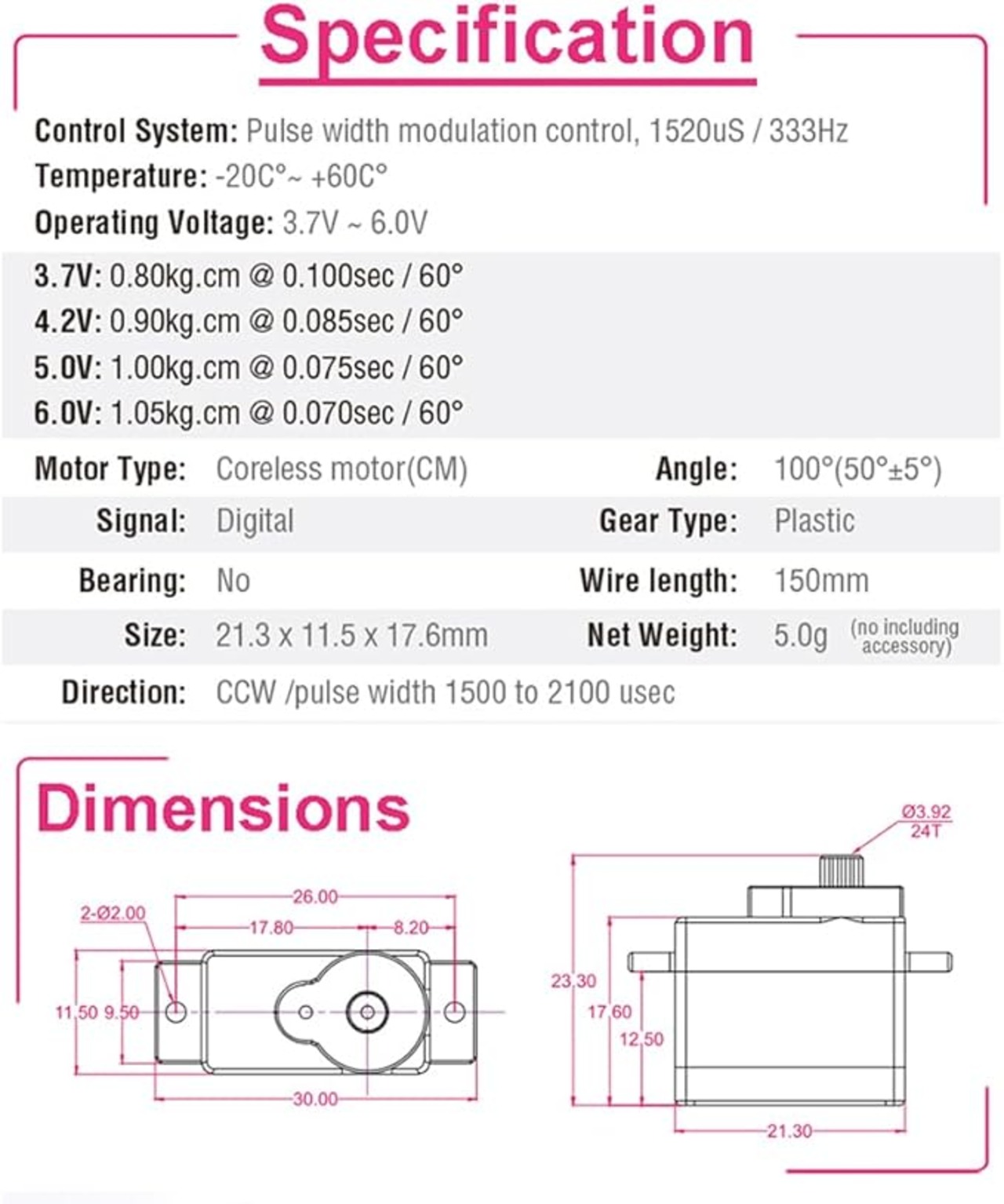 5.0G デジタルマイクロプラスチックステアリングギアサーボRCパーツ RCカー ロボット ボート RC飛行機 固定翼航空機 (JRプラグ)