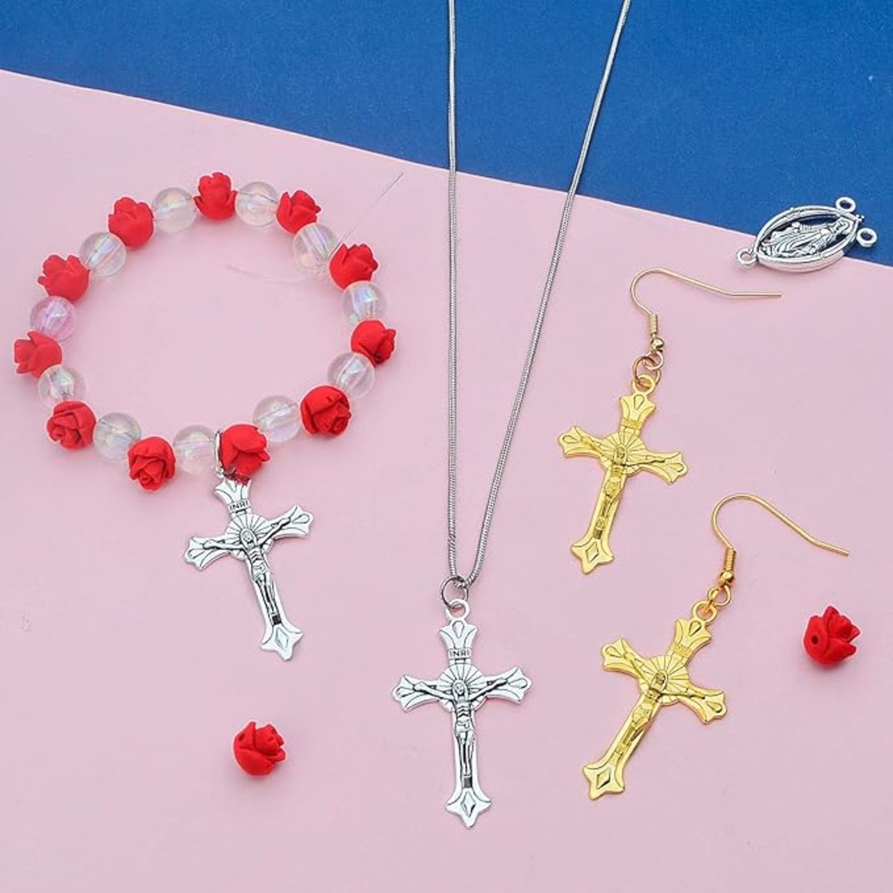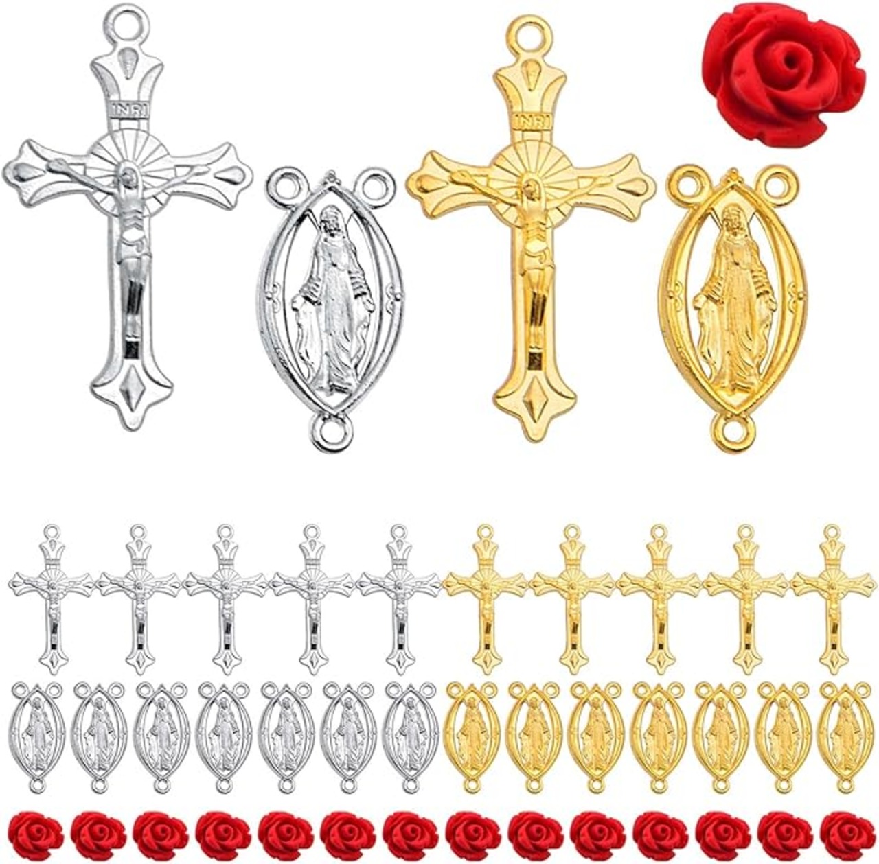豊富な数量:レッドローズビーズ60個、バージンメダルチャーム20個、ロザリオ十字架チャーム20個、各色10個、合計100個、数量は十分で、DIYロザリオブレスレットジュエリー製作に最適です。