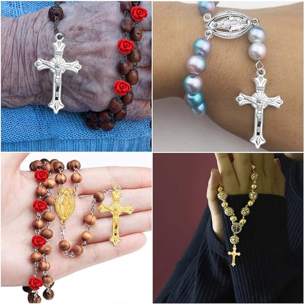 幅広い用途: 赤いバラの花ビーズオーナメントとロザリオクロスペンダントとイエス 聖母マリア 3穴ペンダントは、DIYロザリオ作り、ブレスレット、ネックレス、キーチェーン、オーナメントなど、あらゆる種類のジュエリー製作に最適です。