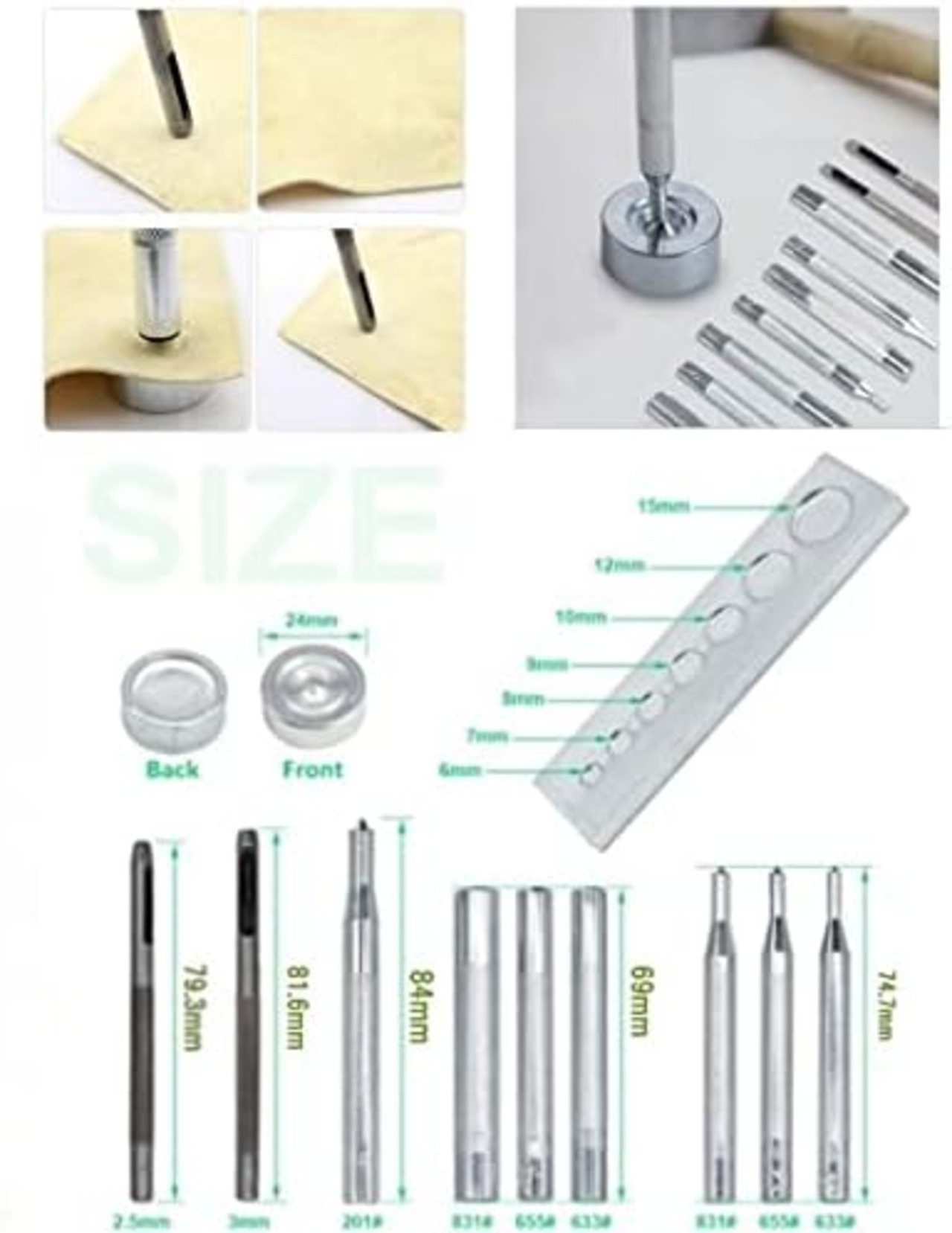 セット内容: 万能打ち台(6mm、7mm、8mm、9mm、10mm、12mm、15mm)、 ハトメ抜きポンチ(3mm、2.5mm)、 ホック打ち具(831 2本、633 2本、655 2本、201 1本)、 打ち台