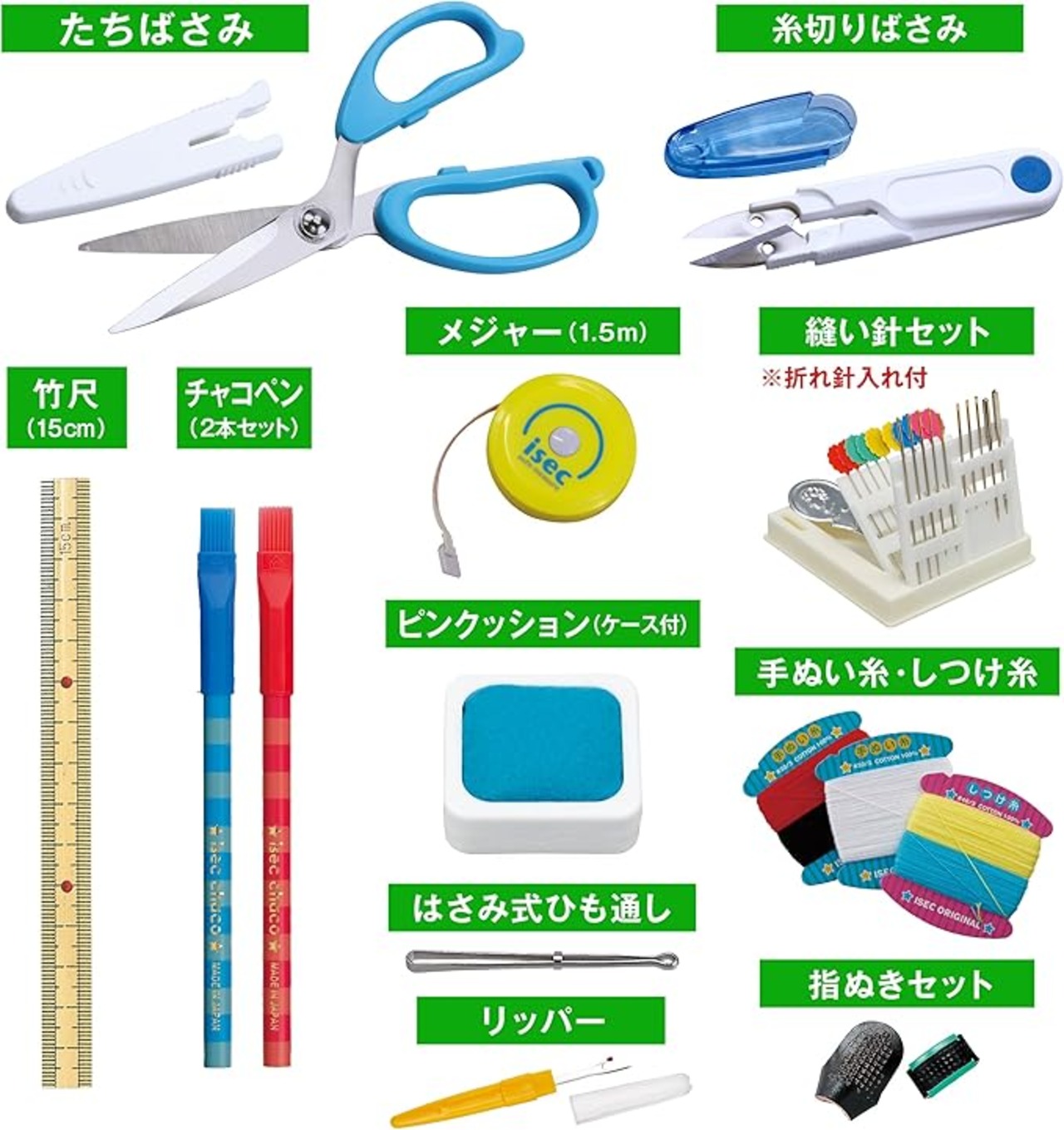 付属コンポーネント たちばさみ、糸切りばさみ、指ぬきセット、自動巻メジャー、はさみ式ひも通し、竹尺、チャコペン 2 本セット、ピンクッション、手ぬい糸 3 色、しつけ糸 2 色、ぬい針セット、リッパー