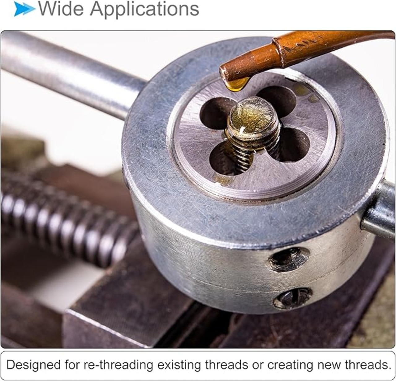 ★ 便利なヒント --- 潤滑剤(オイルや冷却剤など)を使用し、一定の圧力をかけ、ダイスをゆっくりと安定して回転させてください。定期的にダイスを逆転させてチップを破砕し、詰まりを防ぐことが重要です。スレッドを作成するオブジェクトの直径に適切なサイズのダイスを選択してください。