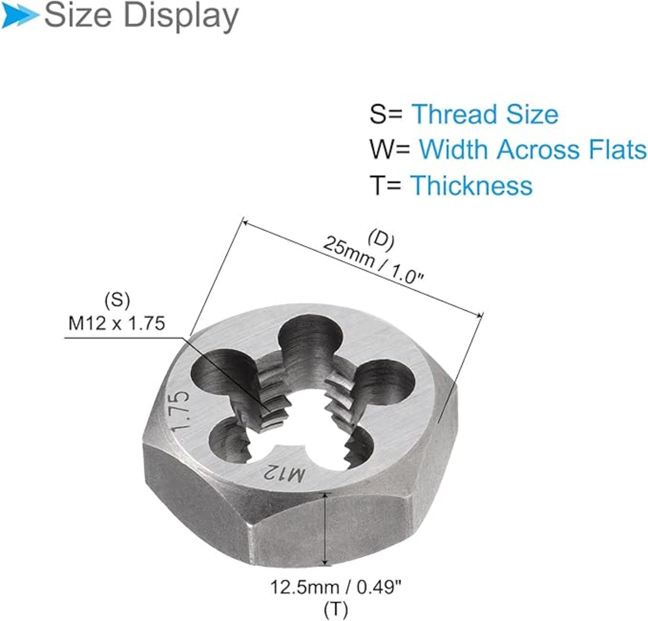 ★ 六角再切削ダイスのサイズ --- スレッドサイズ:M12 x 1.75;フラット幅:25mm / 1.0";厚さ:12.5mm / 0.49";チップポケットの数量:5