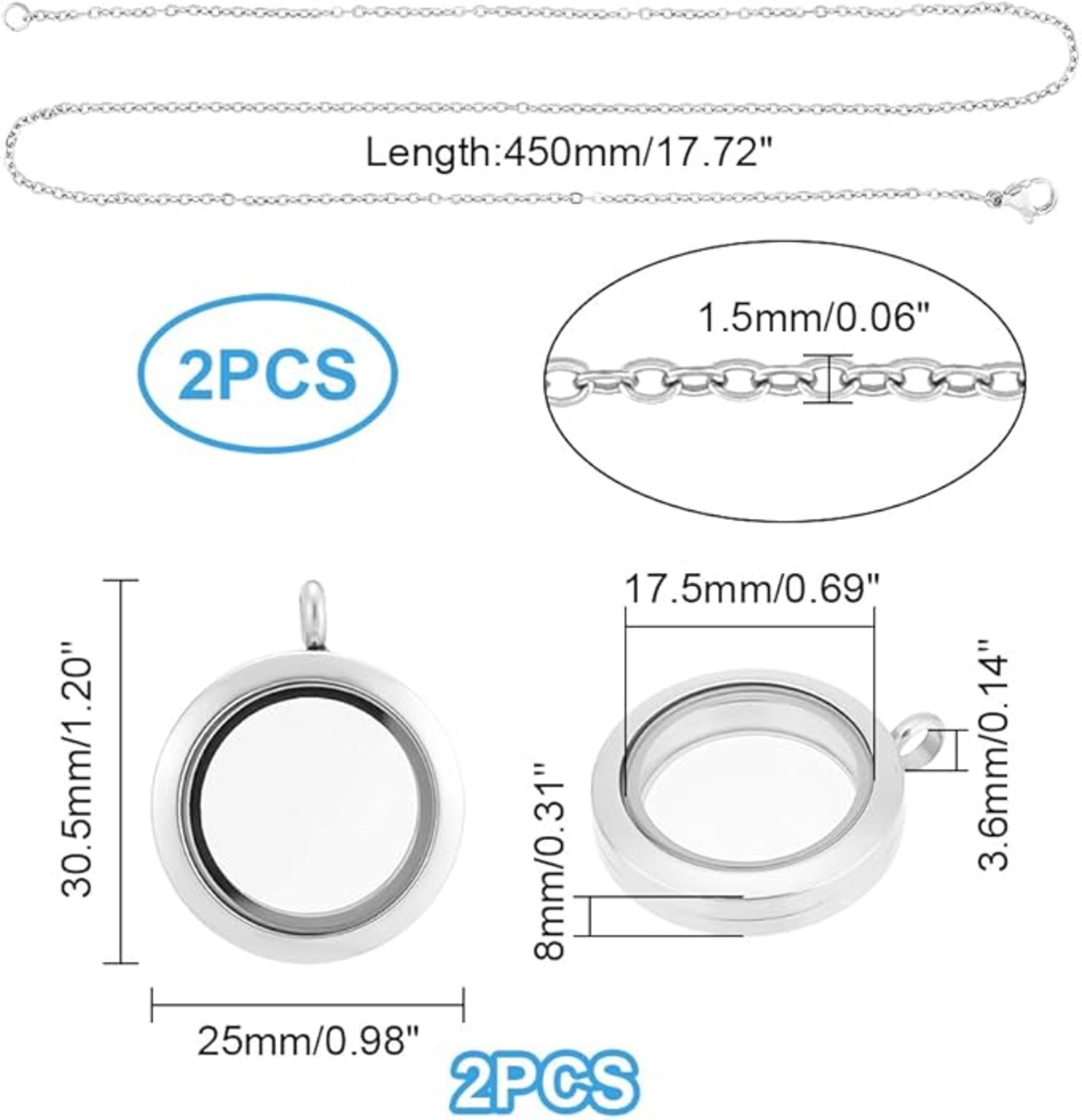 ステンレススチールメモリーロケットチャーム フラットラウンド DIY ピクチャーフォトネックレス製作キット チェーンネックレス クリスタル両面フレームガラス容器フローティングチャーム ロケット用 2セット, ステンレススチール, 宝石なし。