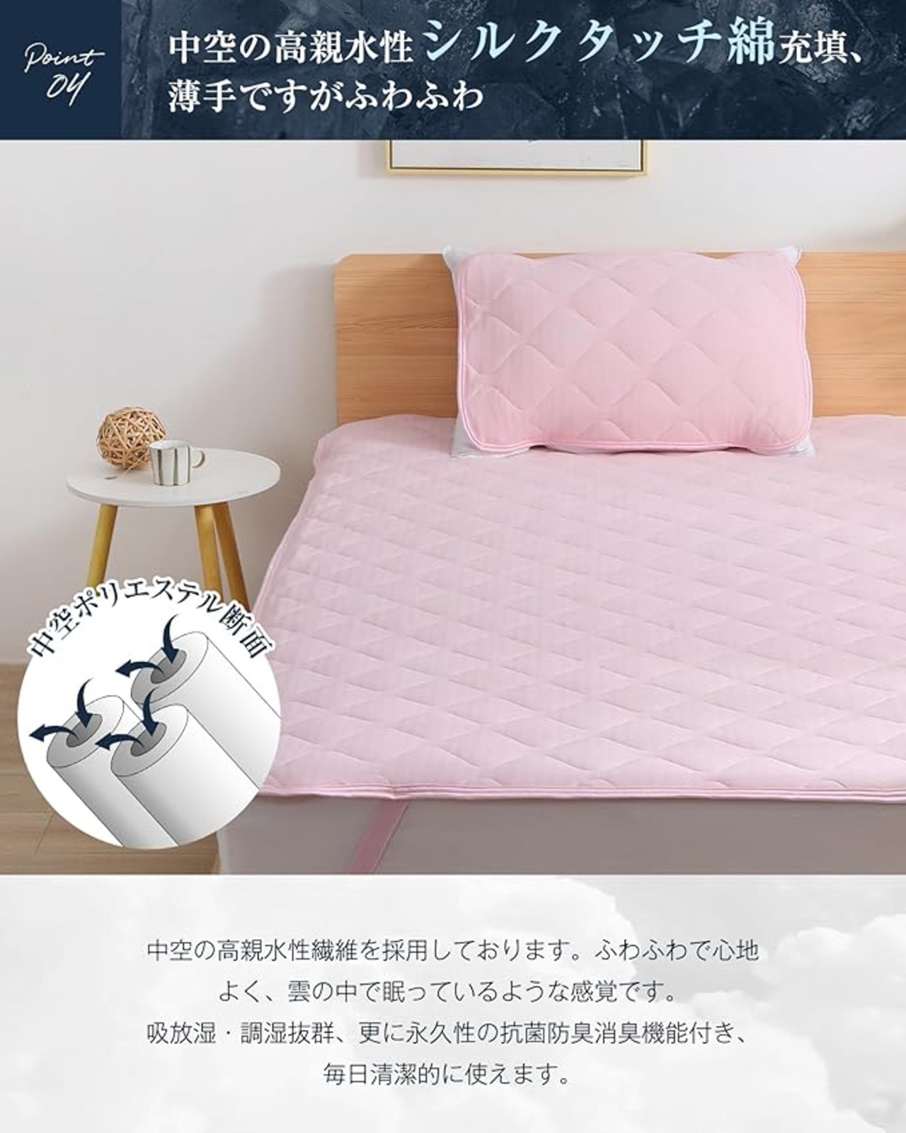 【吸湿速乾・通気性】生地の織り方を変えることで吸水性を高めることができました。汗のにじむ夏の夜でも肌にまとわりつかず、朝までサラサラ快適に快眠できます。吸水性と通気性に優れた素材のため、敷きパッドは汗などの水分をたっぷり吸収し、こもった水分を拡散させ、速乾してさらっと快適にお使いいただけます。通気性のいい構造と吸湿性の高い素材を使用しており、熱さも湿気も素早く吸収して放出します。汗をかきやすい夏だから、 中綿はウイルスを寄せ付けない清潔快適わたを使用しました。防ダニ・抗菌・防臭の三つの機能をもつだけでなく、軽量で通気性がよく、ヘタリにくいのも特長です。