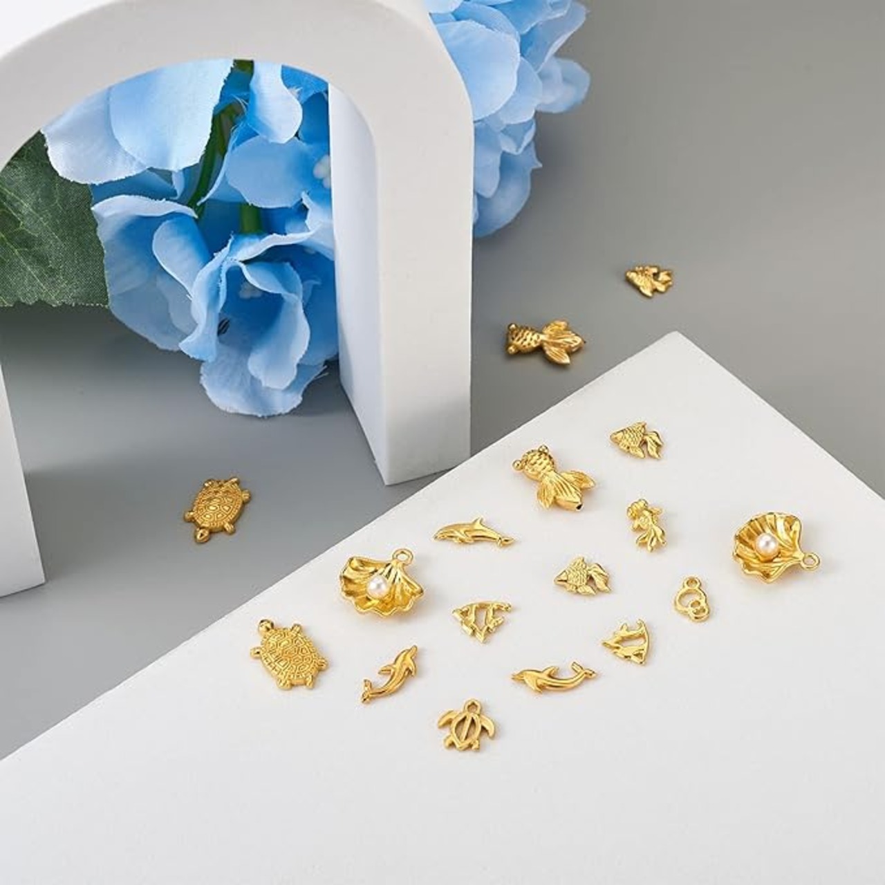 Beadthoven 約100個/箱 10種類 ゴールド メタルパーツ 海の動物 魚 金魚 イルカ 合金カボション ネイルパーツ UVレジン 封入素材 デコパーツ アクセサリーパーツ ジュエリー用 DIY ハンドメイド 手芸材料 手作り素材