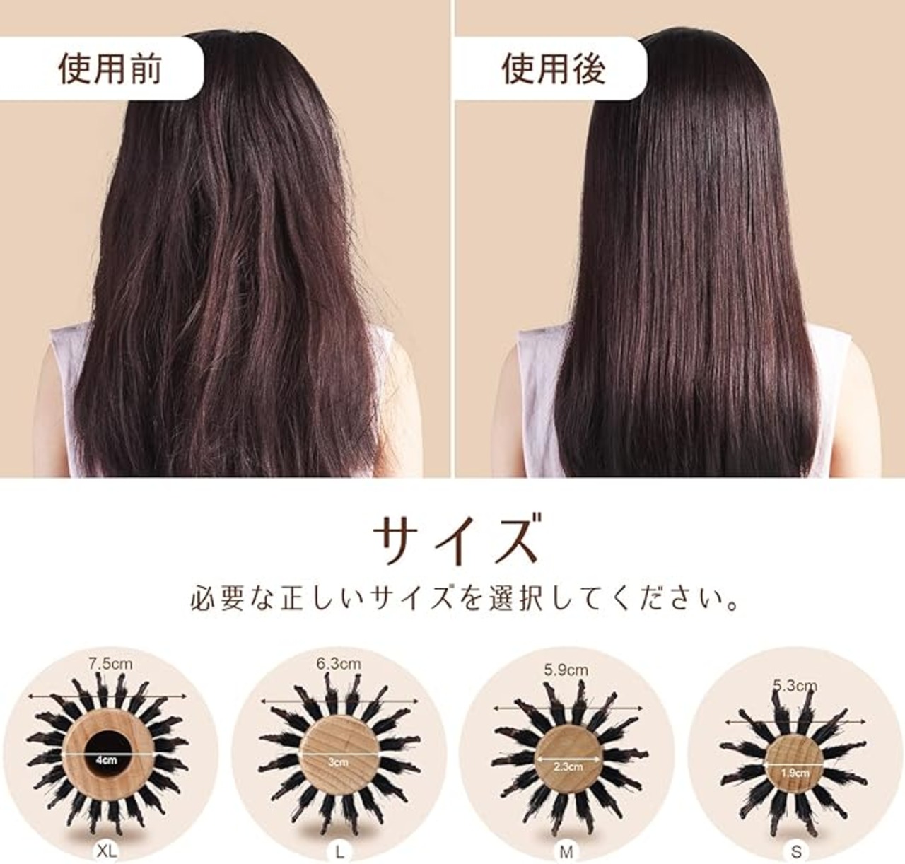 【使用方法】ロールブラシは巻き髪スタイルだけではなく、ストレートヘアにも適しています。直径が太いロールブラシでブラッシングすると、くせ毛を伸ばす効果が得られるので、ストレートに伸ばしたい場合は大きめのサイズがおすすめです。