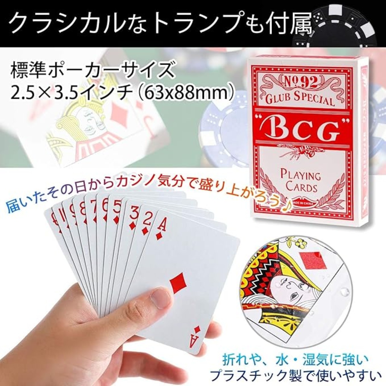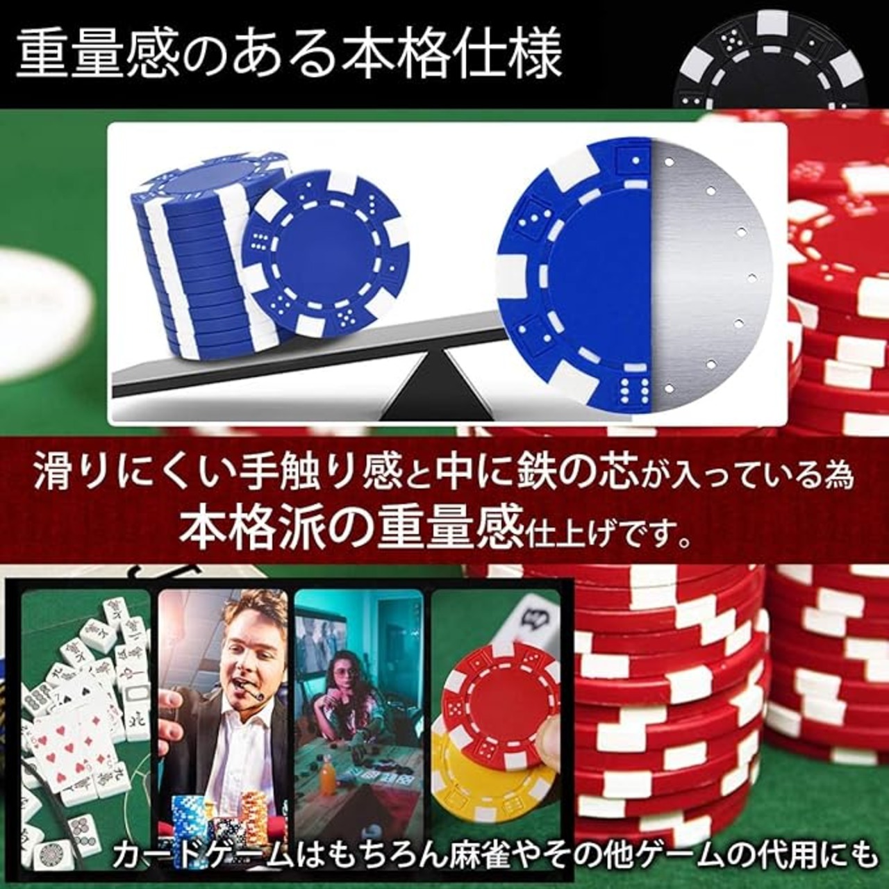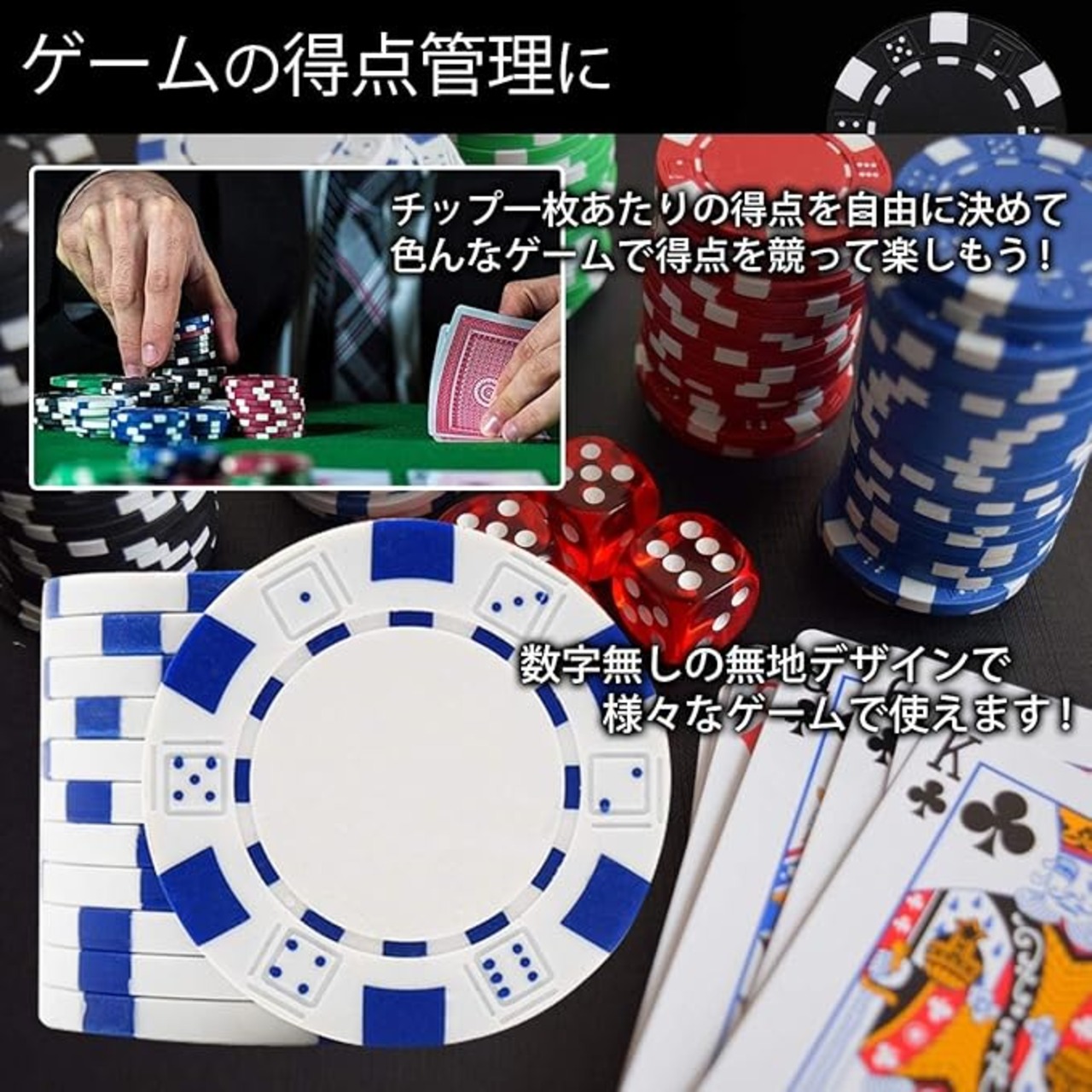 【こんな場面にも】カジノチップとしてのご利用はもちろん、他のゲームの得点管理などにもご利用頂けます。トランプに関しても単体で使用頂ける商品となります。