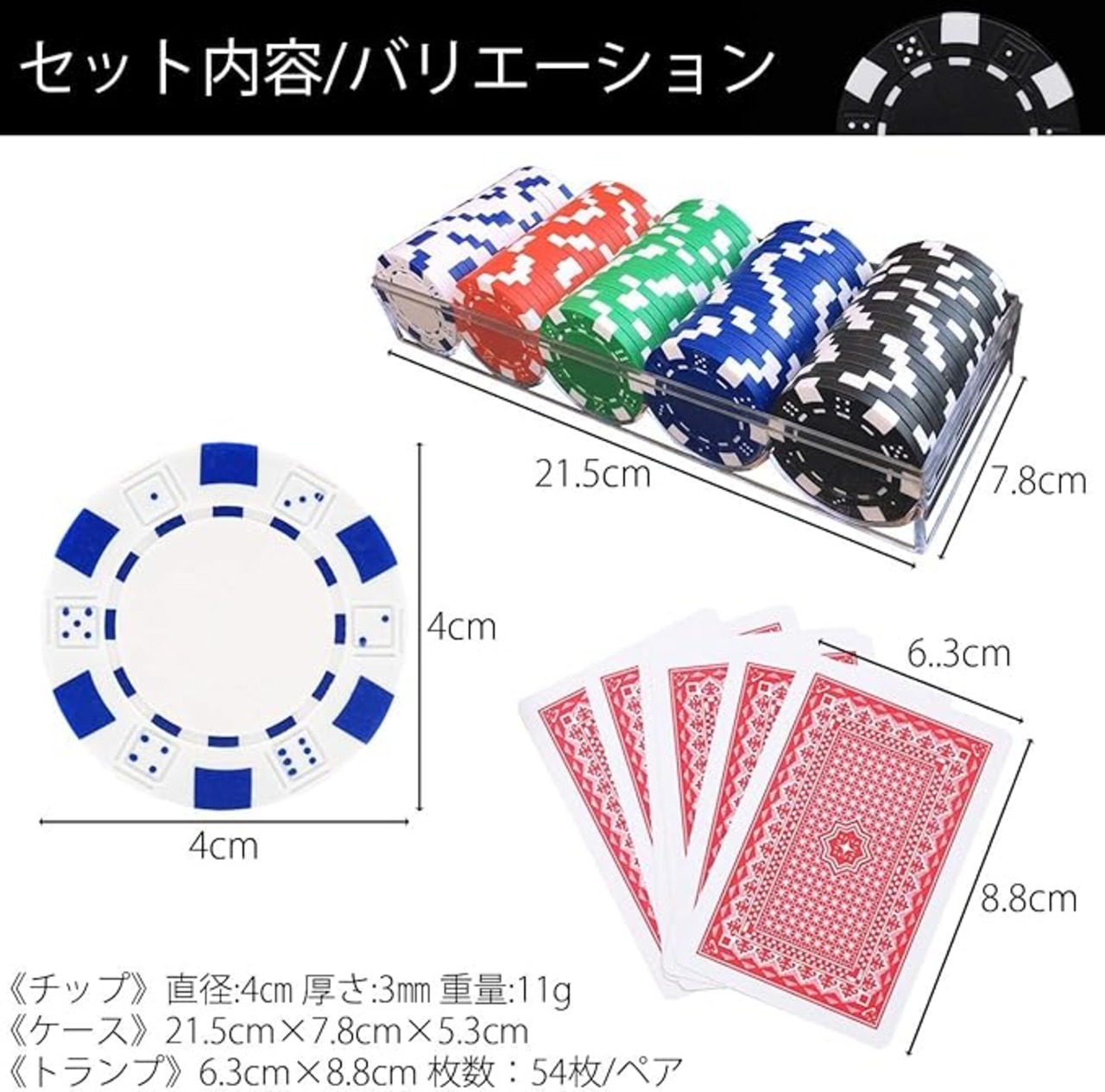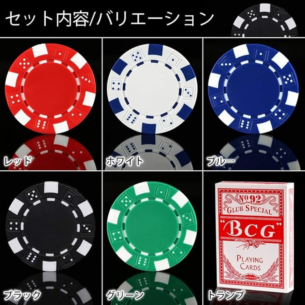 【商品内容】チップ100枚(白、緑、黒、青、赤 → 各20色)付属品に専用ケース、トランプまで付属しております。