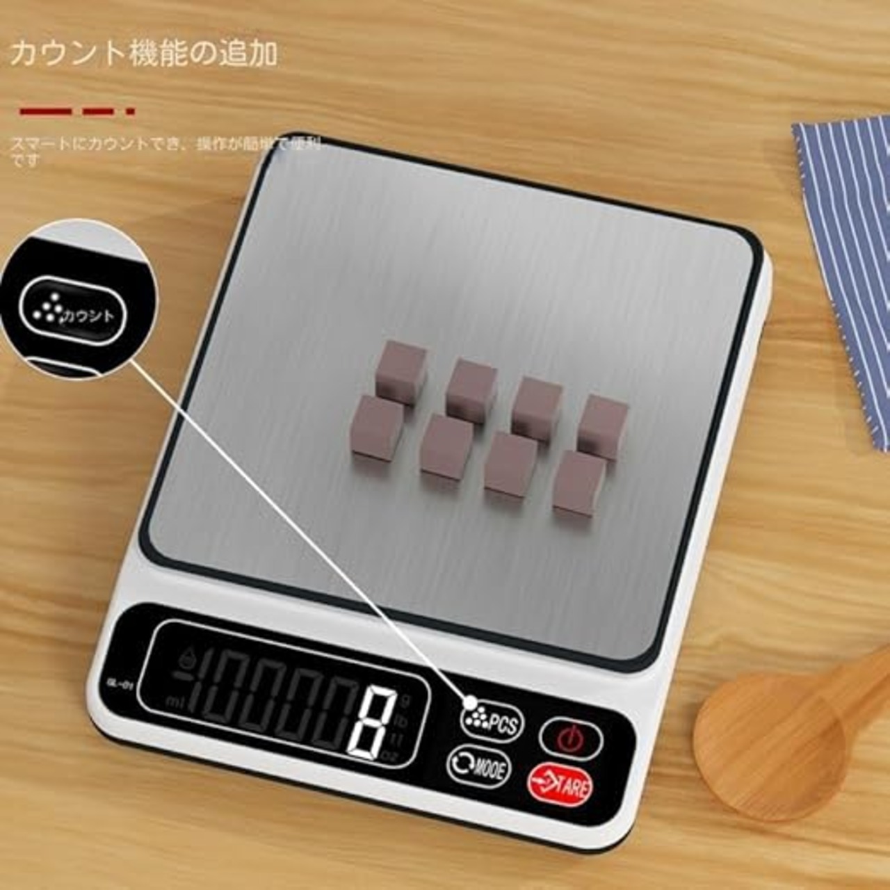 【多機能、使用が簡単】計数機能 風袋引き、mlモード(水、牛乳)、オートオフ(約3分)、重量オーバー提示、バッテリー不足提示機能があります