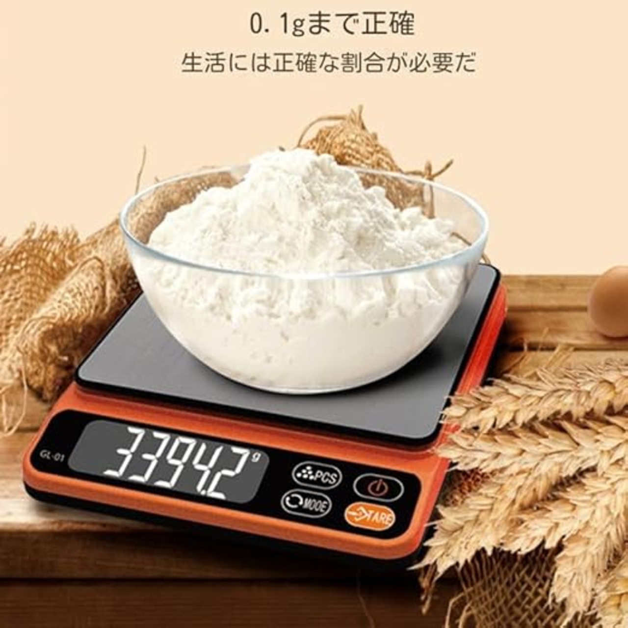 デジタルスケール 0.1g単位 5kg はかり mlモード付き 計数機能 コンパクト 薄い 風袋引 テンレス鋼 計量器 スケール (オレンジ)