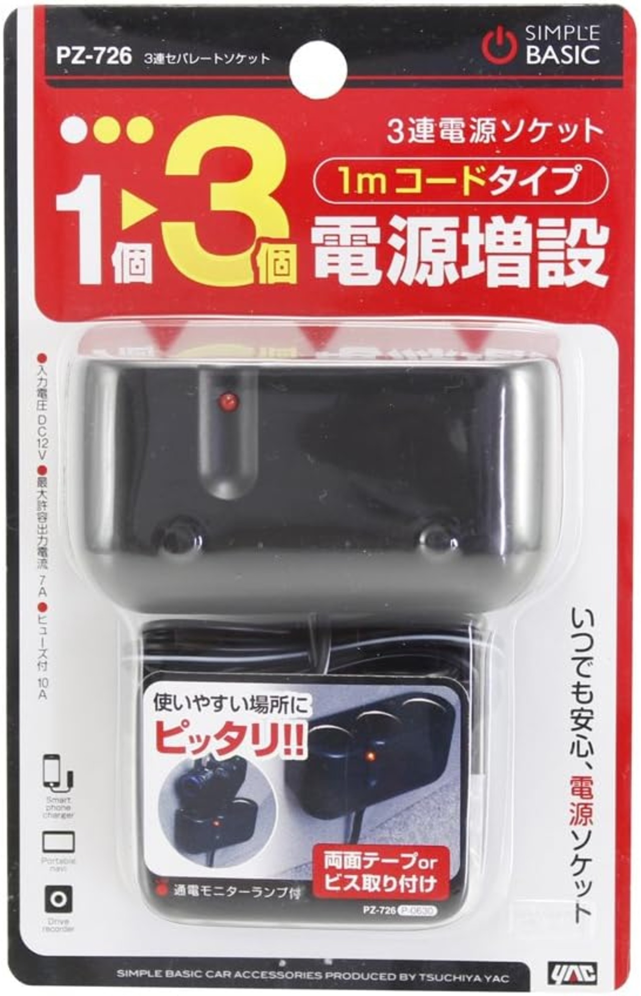 カラー:ブラック DC12V専用 3連コード付きソケット コード長:約1m