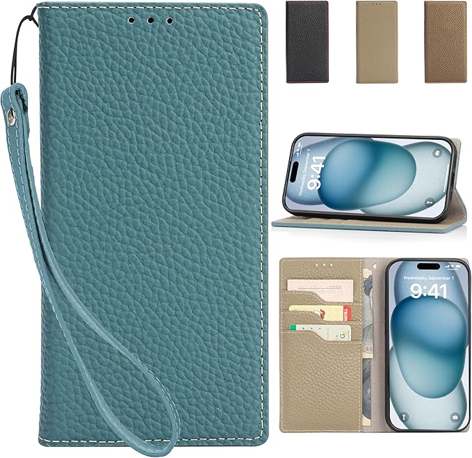CLICSUN iPhone16ProMax 対応ケース 高級牛本革ケース 手帳型 アイフォン16 ProMax 対応 カバー 本革 レザー いPhone 16 Pro Max カバー スタンド機能 ストラップ付き マグネット式 カードポケット ブルー グレー | etshop