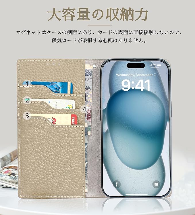 【性能抜群】横置きスタンド機能が付いて、好きな角度で動画鑑賞や読書などを楽しめます。内側には三つのカード入れとフリーポケットが付き、名刺や定期券の収納に優れています。そして、簡単に開け閉めができるから、片手で開きたい方にもとても便利です。ワイヤレス充電も対応できます。