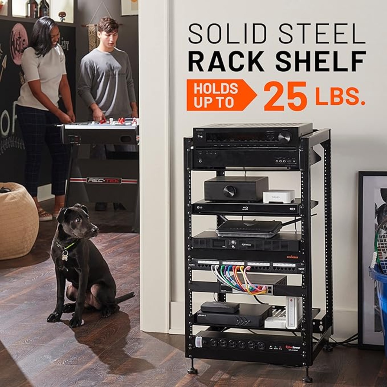 幅19インチ、奥行き12インチのこの1Uシェルフは、幅広いネットワークやAVコンポーネントに対応できます。