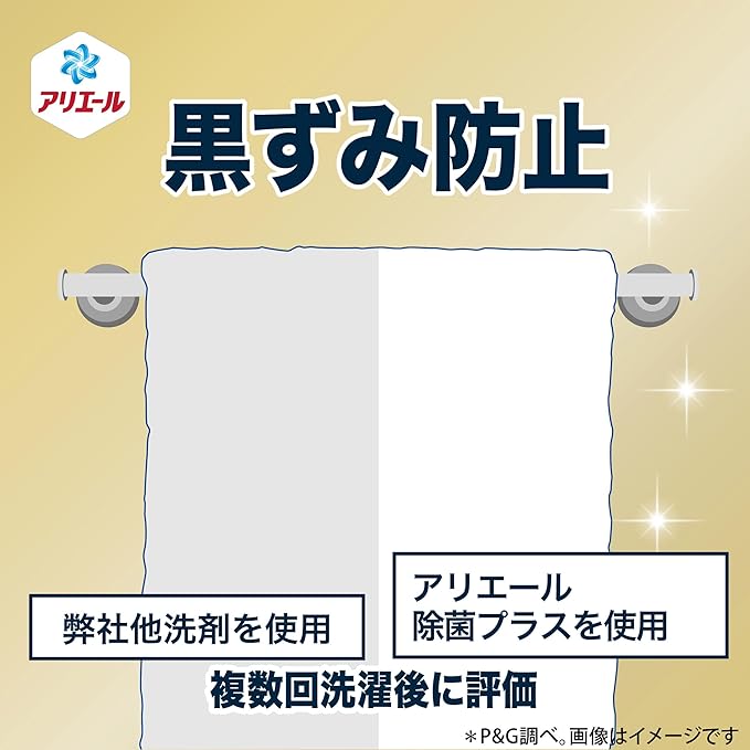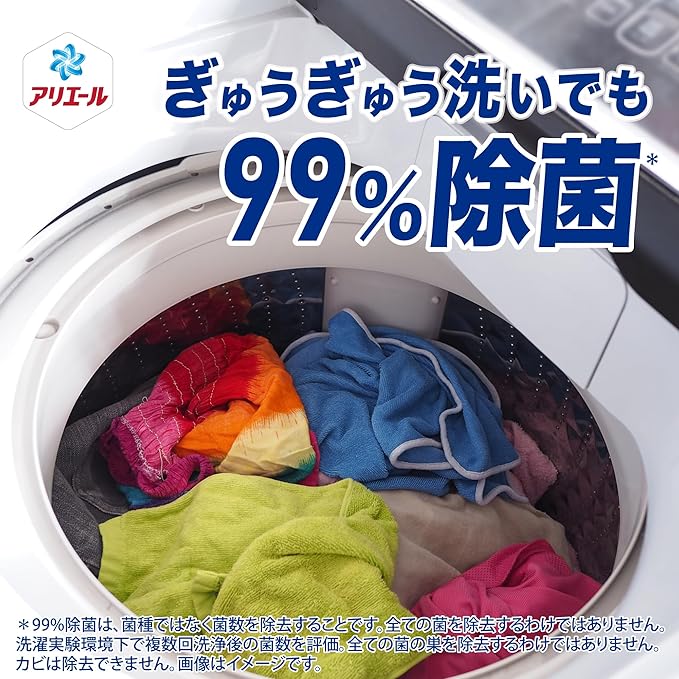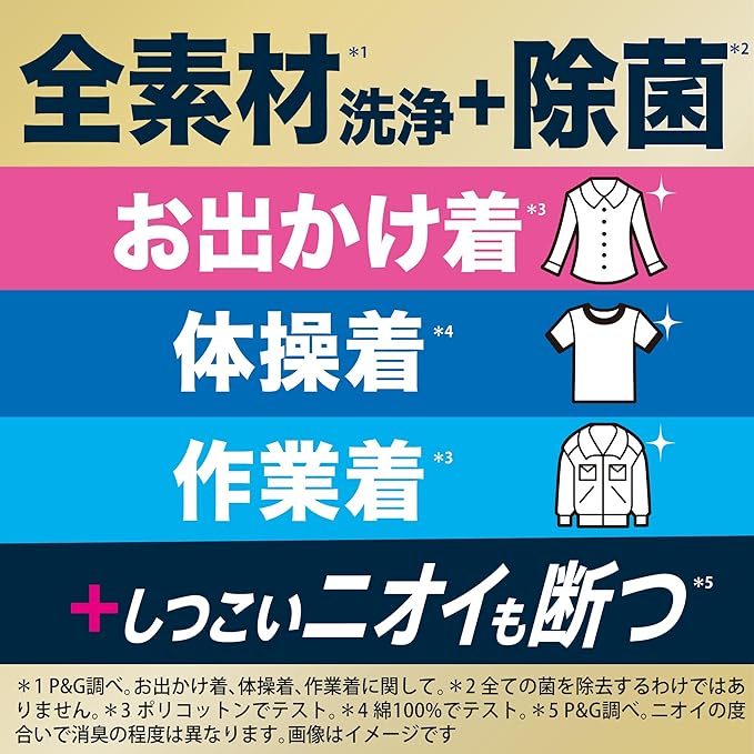 *1 P&G調べ。お出かけ着、体操着、作業着に関して。 *2 全ての菌を除去するわけではありません。 *3 ポリコットンでテスト。 *4 綿100%でテスト。 *5 P&G調べ。ニオイの度合いで消臭の程度は異なります。 *6 洗濯実験環境下で複数回洗浄後の菌数を評価。全ての菌の巣を除去するわけではありません。カビは除去できません。 *7 洗濯実験環境下で複数回洗浄後の菌数を評価。全ての菌の巣を除去するわけではありません。カビは除去できません。 *8 2023年のアリエール超抗菌プレミアムシリーズ比。