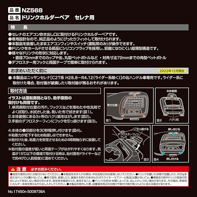 ✅【お求めいただく前に】 ●本製品は以下の車種の右ハンドル車専用です。 日産 セレナ 型式:C27 2016(平成28)年8月~2022(令和4)年12月 ※調査日(2022年12月)以降の仕様変更車には適合しない場合があります。 【適合グレード】 ◆1.2 e-POWER X /1.2 e-POWER XV /2.0 B /2.0 S /2.0 X /2.0 XV 【※AUTECH/G/ハイウェイスター/ライダー/NISMO/プレミアムインテリア(インパネレザー張り)のオプション装着車等のドリンクホルダー装着部位が柔らかい内装は、ドリンクホルダーフック部が届かない場合があるため装着できません。無理に取り付けた場合、取り付け面が破損したり取り付け跡が残る恐れがあります。】