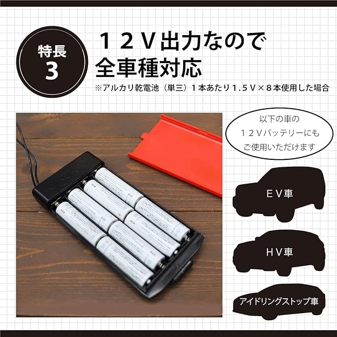 ■単三乾電池8本で12V出力となり、幅広い車種への適合を実現