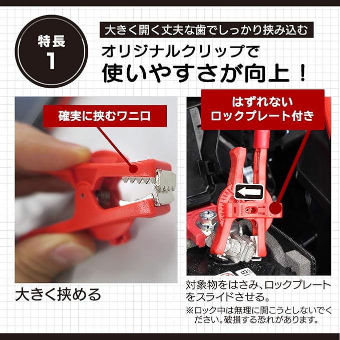 ※注意※バッテリーターミナルをはさむワニ口クリップは、プラス・マイナスを接触させないよう注意してください。ショートし内蔵ヒューズを破損させる恐れがあります。