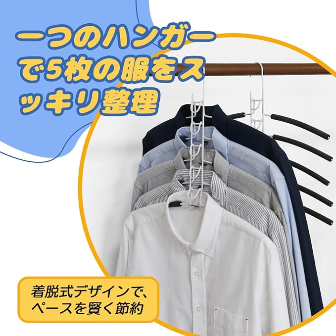 縦横に5枚まで掛けられる多機能ハンガーで、クローゼットのスペースを有効活用できます。衣類の整理整頓がもっと簡単に!
