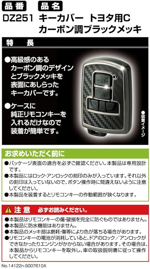 色:カーボン調ブラックメッキ 商品紹介 【トヨタ純正リモコンキー(スマートキー)専用カバー】本製品はトヨタ純正リモコンキー(スマートキー)専用のキーカバーです。オススメ車種:※R3(2021)年12月現在トヨタ アルファード (H27.1~) H3#W系 トヨタ ヴェルファイア (H27.1~) H3#W系 トヨタ ヴォクシー (H26.1~ ) R8#W/R8#G系 トヨタ エスクァイア (H26.10~ ) ZRR8#G/ZWR80G系 トヨタ オーリス (H24.8~H30.6 ) E18#H系 トヨタ カムリ (H23.9~H29.7 ) AVV50系 トヨタ クラウン (H24.12~H30.6 ) S21#系 トヨタ クラウンマジェスタ (H25.9~H30.6 ) S21#系 トヨタ シエンタ (H27.7~ R2.6) P17#G系 トヨタ シエンタ (R2.6~ ) P17#G系 トヨタ ノア (H26.1~ ) R8#W/R8#G系 トヨタ ハリアー (H25.12~R2.6 ) ZSU6#W/AVU65W/ASU6#W系 トヨタ プリウスα(アルファ) (H28.5 ~R3.4 ) ZVW4#W系 ダイハツ アルティス (H24.5~H29.7 ) AVV50N ダイハツ メビウス (H28.5~R3.2 ) ZVW41N ※グレード・年式等でリモコンキーの種類が異なる場合があります。お持ちのリモコンキーが画像と同じ形かご確認ください。※上記にない車種でもリモコンキーのタイプ(形)が同じであれば装着可能です。【簡単装着】本製品はコインでケースとカバーを外し、リモコンキー(スマートキー)を入れてカバーを取り付けるだけで簡単にお使いいただけます。【大人の装いカーボン調デザイン&ブラックメッキ】リモコンキーを傷から守りながら、カーボン調ブラックメッキでリモコンキーを大人の装いに変えます。【ロックアンロックの刻印入り】本製品には、ロックとアンロックの刻印が入っています。※ロック・アンロック以外の刻印は入っていません。ボタン操作時に間違えないように注意してください。●必ずお読みください-注意-・本製品はリモコンキーの傷・破損を完全に防ぐものではありません。・本製品に防水機能はありません。・リモコンキーの電池が消耗していると、ドアのロック/アンロックができなかったりエンジンがかからない場合があります。その場合は、本製品からリモコンキーを取り外し、車の取扱説明書に従って操作してください。●安全警告本製品は専用設計です。使用可能(適合型)かどうかを必ずご確認ください。 使用上の注意 ●本製品はリモコンキーの傷・破損を完全に防ぐものではありません。●本製品に防水機能はありません。●リモコンキーの電池が消耗していると、ドアのロック/アンロックができなたかったりエンジンがかからない場合があります。その場合は、本製品からリモコンキーを取外し、車の取扱説明書に従って操作してください。