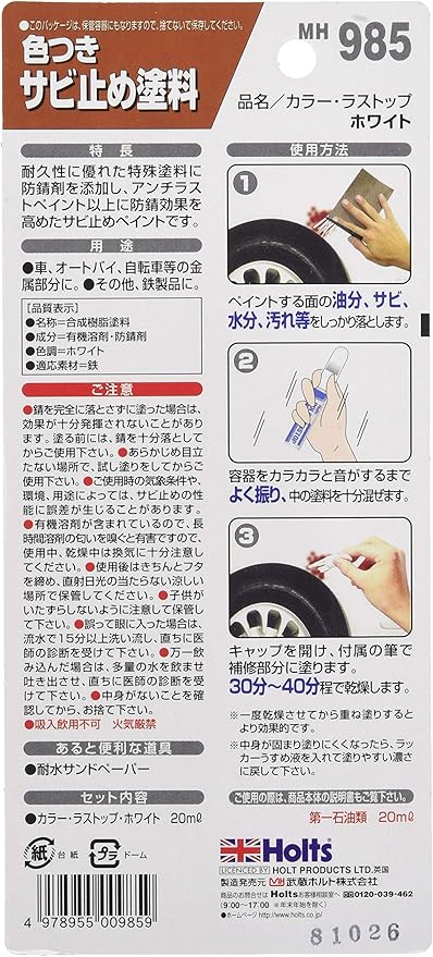 錆を完全に落とさずに塗った場合は効果が十分に発揮されないことがあります。塗る前には錆を十分に落としてからご使用ください。あらかじめ目立たない場所で試し塗りをしてからご使用下さい。ご使用時気象条件や環境、用途によっては錆止めの性能に誤差が生じることがあります。車内に保管しないでください。