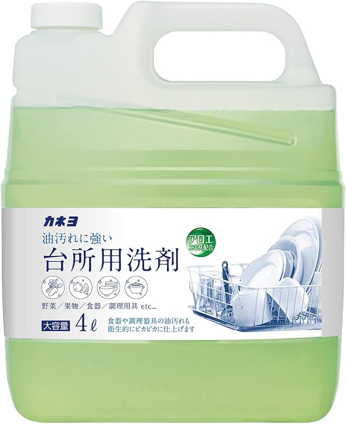 カネヨ石鹸の4L入りの台所用洗剤です。 泡立ちがよく、ベトベトした油汚れも洗い落とします。 使用後につぶせる容器です。 野菜・果物を洗うときは5分以上つけたままにしない。 流水の場合、食器及び調理器具は5秒以上、野菜・果物は30秒以上、ため水の場合は水をかえて2回以上すすぐ。