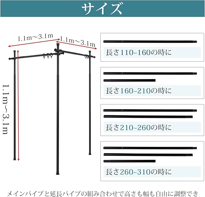 【超広い調整範囲】横棒も縦棒と同じ伸縮調整構造を革新的に採用し、幅と高さの調整範囲が大幅に広がり、市場では珍しい1.1M-3.1Mに達します。 広い調整範囲により、あらゆるシーンに適しています。