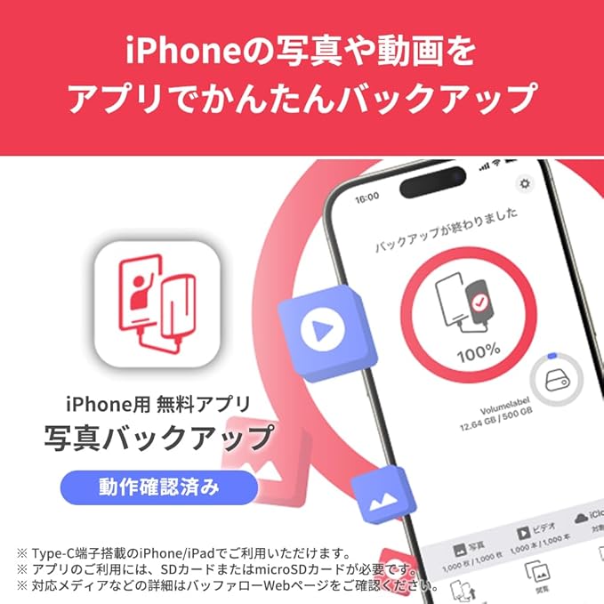 【iPhoneの写真・動画を簡単バックアップ】バッファロー純正アプリ「写真バックアップ(無料)」に対応。Type-C搭載iPhoneに接続し、アプリを起動するだけで、写真や動画をSD/microSDカードに自動でバックアップできます。※対応メディアやアプリの詳細はバッファローWebをご確認ください。
