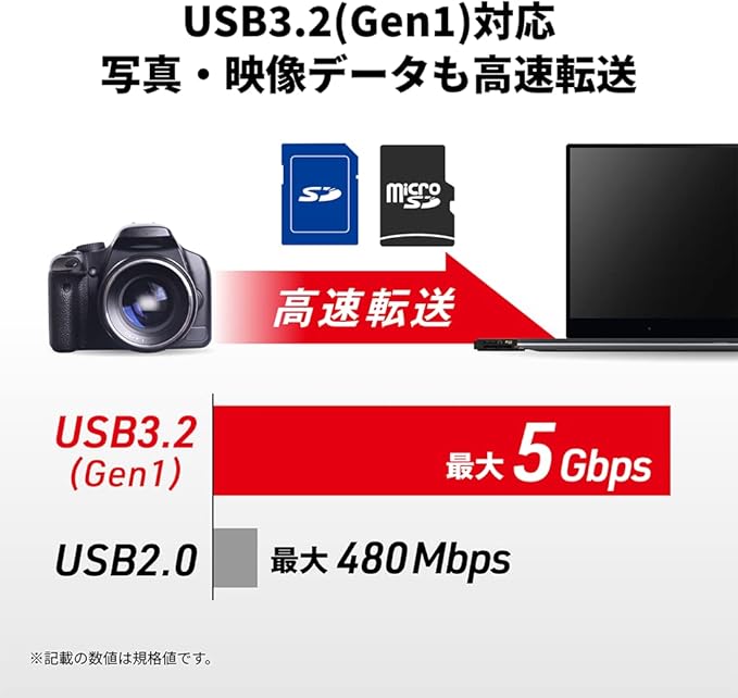■最大通信速度 USB 3.2(Gen 1)/3.1(Gen 1)/3.0:最大5Gbps(規格値)、 USB 2.0:最大480Mbps(規格値)、 USB 1.1:最大12Mbps(規格値)