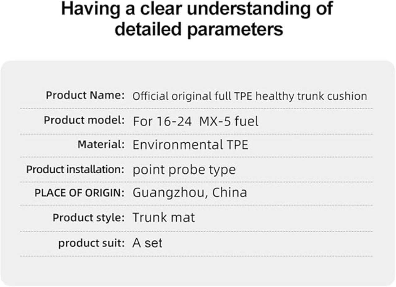 車両MX5専用に設計されたこのトランクマットは、車両のトランクスペースに優れたフィット感と包括的な保護を提供します。