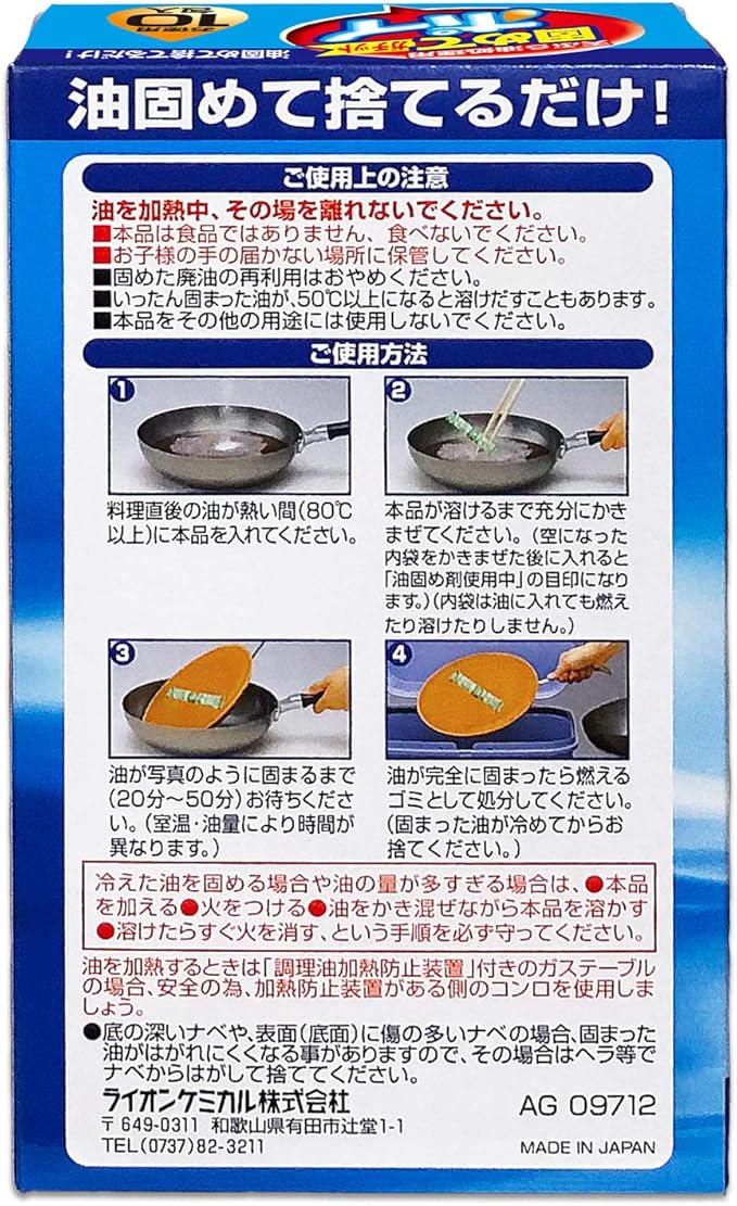 特徴:油を固めて捨てるだけの廃油処理剤。手やキッチンを汚さず食用油の廃油処理が簡単にできます。