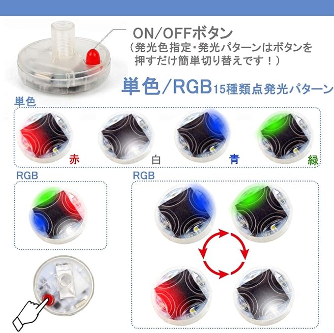 ご注意: ライト不点灯原因:1.十分なソーラー充電はありません(対策:ご使用前に2時間以上太陽の下に置いて充電してください。)2.昼間または強い光で使用(対策:夜間暗い環境で使用ライトが点灯します。)3.車の運転速度は遅すぎます(対策:速度は20KM/H以上で運転)4.ライトのOFFボタンを押しました(ボタンを長く押しで、ライト再開します)