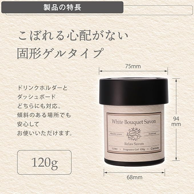 ✅ こぼれず、香り立ちが良い固形ゲルタイプ 固形ゲルタイプはこぼれる心配がないため、傾斜のある場所でも安心してお使いいただけます。うっかり倒してこぼれる心配もございません。香料以外の主成分は純水を使っているため、混じり気が無く、やさしい香り立ちを楽しむことができます。