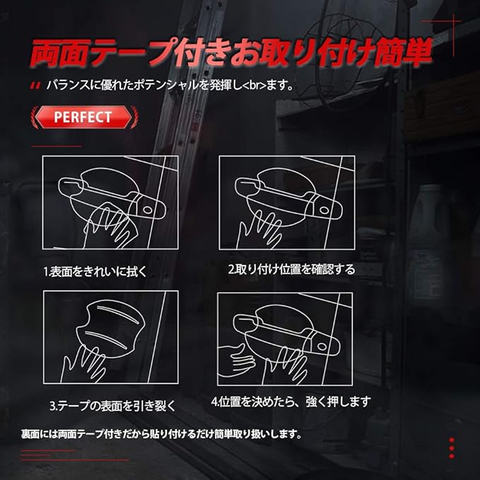 【取り付けが簡単】:裏面に強力な両面テープが貼り付けられてあるため、取り付けは貼るだけで超簡 単、初心者でも楽チン(※装着前に貼り付け部分の油膜を綺麗に拭き取ってください)。