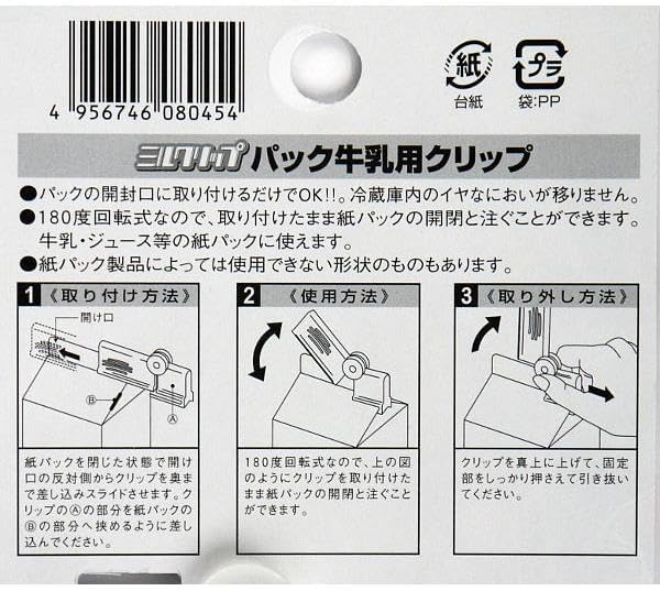 パック牛乳にスライドして差し込み取り付ける構造のクリップで、開閉がワンタッチでできます。