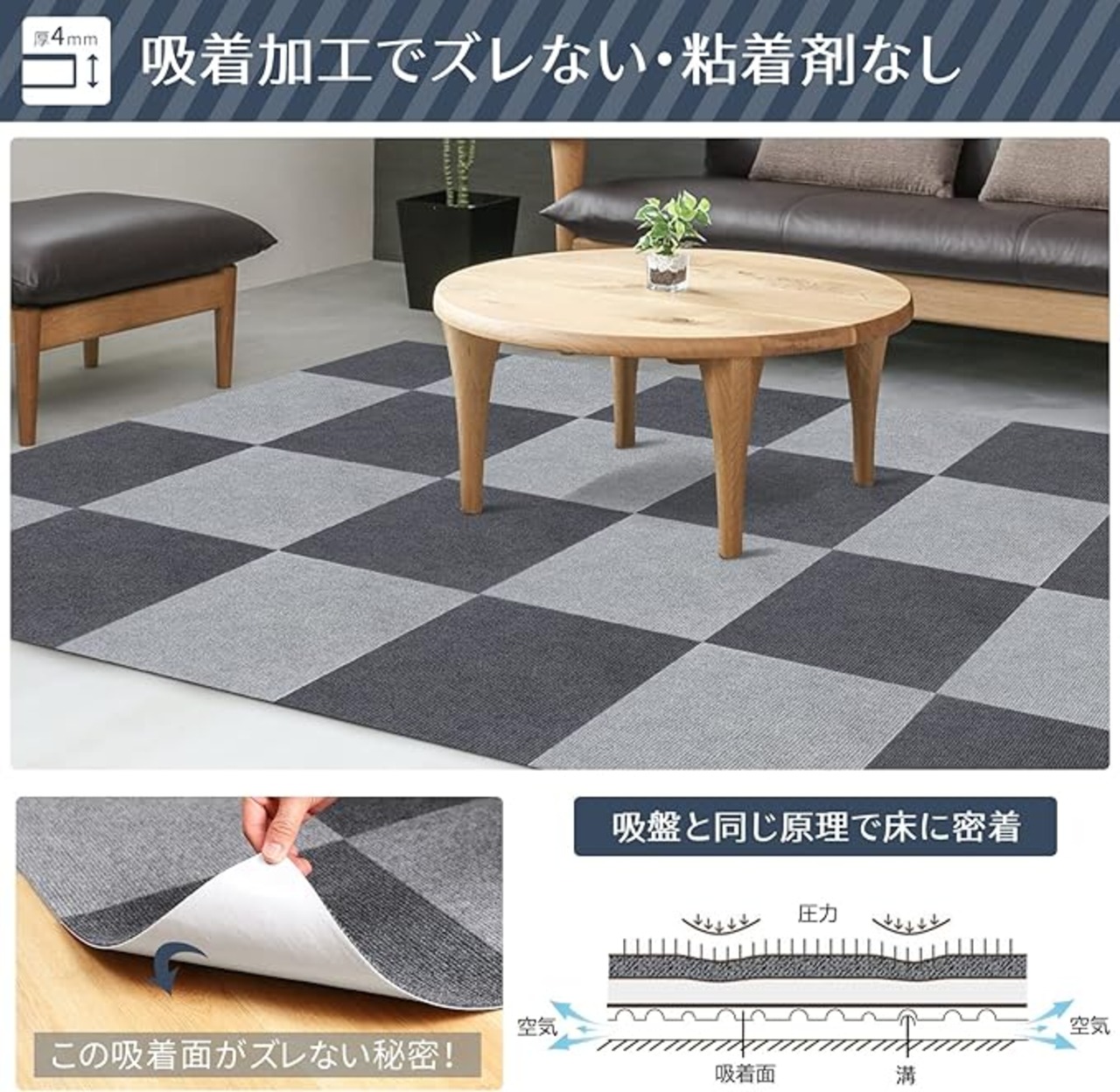 【ズレずに安心!特殊吸着加工でしっかり固定】 裏面には独自の吸着素材を使用しており、敷くだけで床にぴたっと密着。掃除機やロボット掃除機を使用してもズレにくく、めくれ上がることもありません。滑り止め効果もあり、小さなお子様やペットが走り回っても安心です。