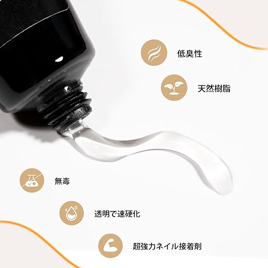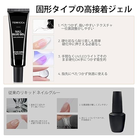 て肌に優しい: TOMICCA ネイルチップ接着剤は、革新的で環境に優しい成分で作られており、低臭、ビーガンおよび動物実験フリー、非毒性で爪と皮膚に無害です、耐久性があるだけでなく。