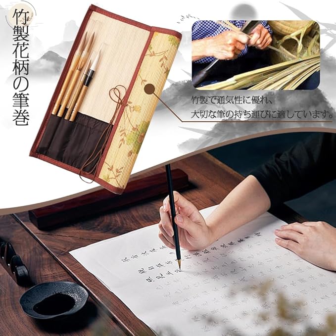 筆巻き 書道 筆入れ 1本セット 竹製 筆ケース 収納 保護が簡単 軽量 通気性 手織筆巻 持ち運びが簡単 習字筆 ポケット付き 7本の筆を収納 日常的な収納 出張用 文房具を保護 贈り物(30CM*26CM) | etshop