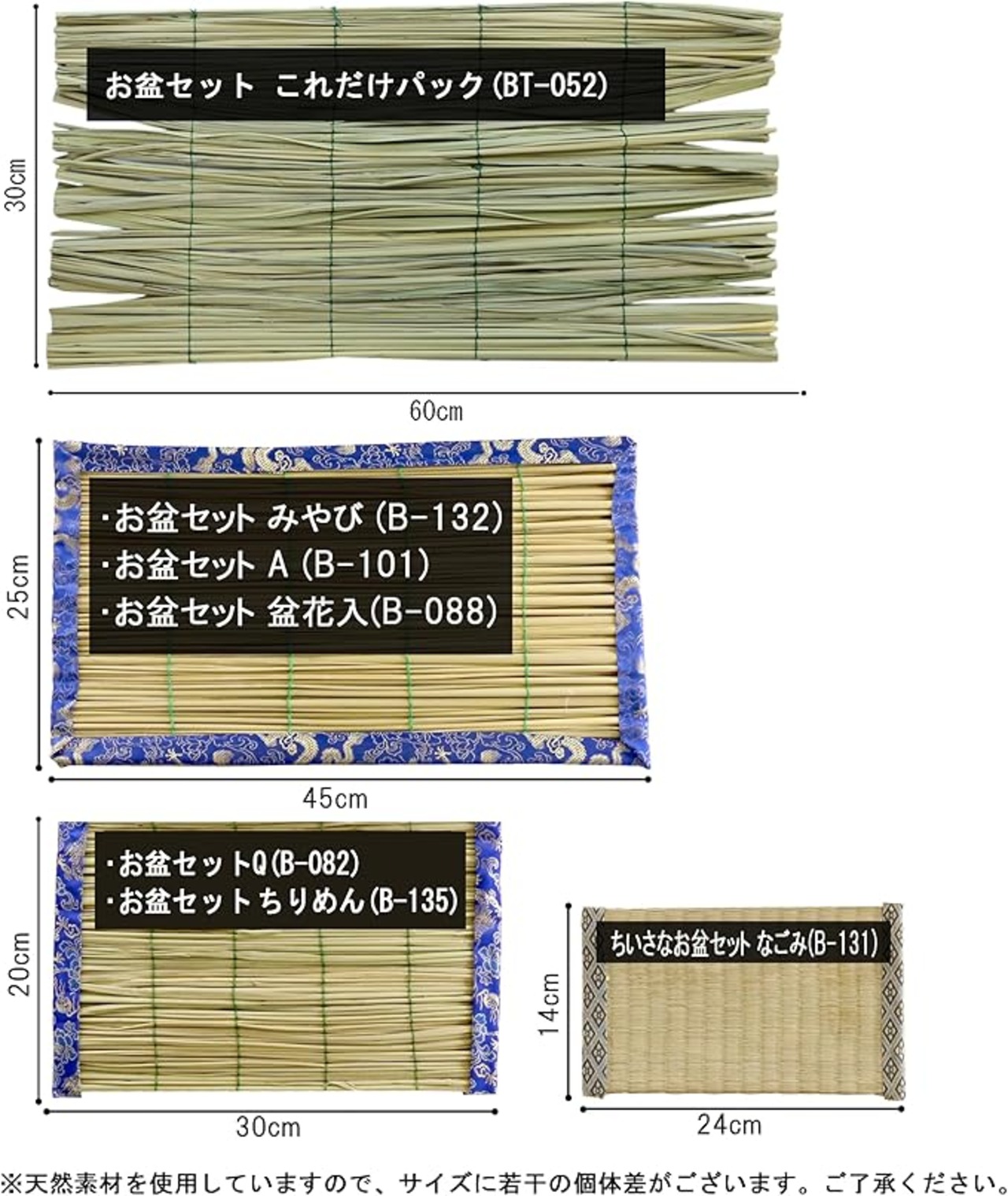 ●マコモ:30 20cm●麻ガラ30cm 5本・ハスの葉(布)直径11cm●ちりめん牛(ナス):9.5 6cm●ちりめん馬(キュウリ):11.5 6cm●ほおずき 2個