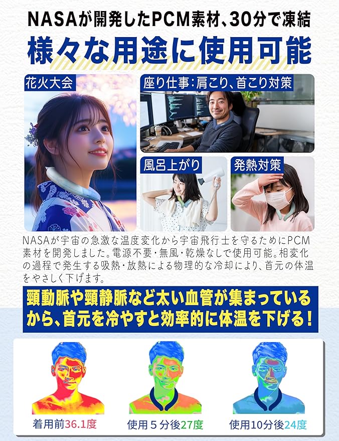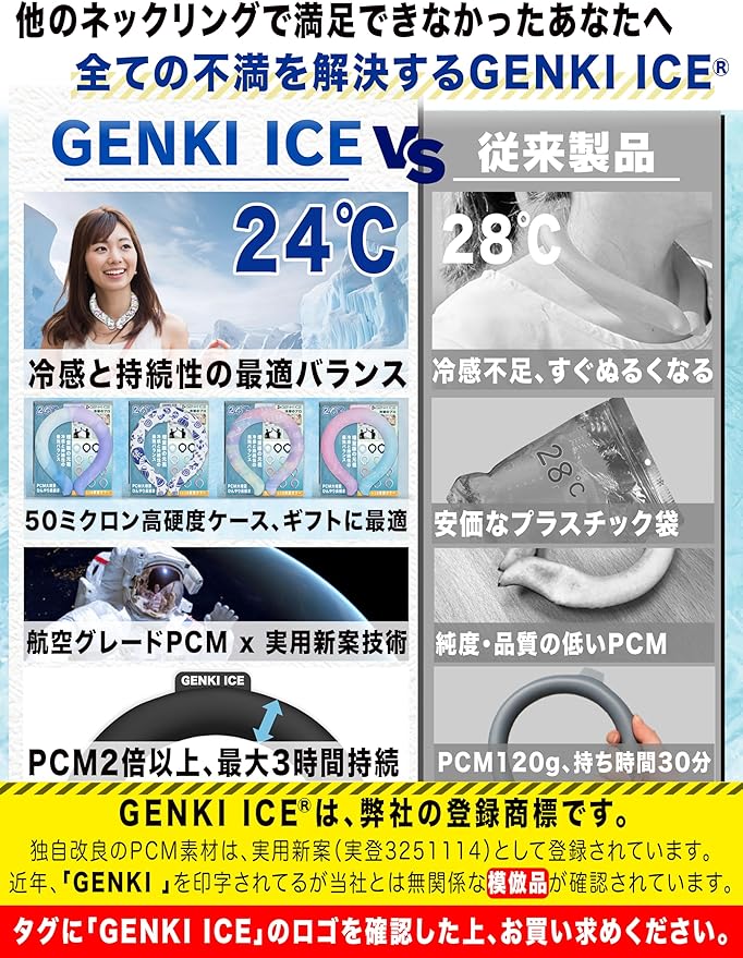 【NASA由来のPCM採用・しっかり冷たい24℃設計】NASAが開発した温度調節素材「PCM」を使用。アイスネックリングは、クールリング、ネッククーラー、アイスネックリング、クールネックリング、ネックアイスバンドやネッククールリングとも呼ばれ、首周りを冷やすグッズです。大人から子供まで、熱中症対策や暑さ対策に最適な商品です。【24℃を選ぶ理由】PCMの温度が25℃を超えると、冷感受容体(TRPM8)への刺激が弱まり、「温度順応(thermal adaptation)」によって冷たさを感じにくくなると言われています。そのため、多くの方が「最初だけ冷たくて、すぐにぬるく感じる」といった冷却グッズへの物足りなさを感じてしまいます。Genki Iceは、しっかりと冷たさを実感できる最適温度である24℃ PCMを採用。さらに2倍の内容量で冷感と持続性のベストバランスを実現しています。